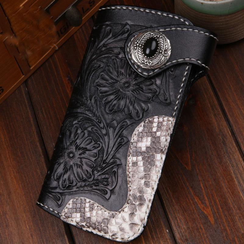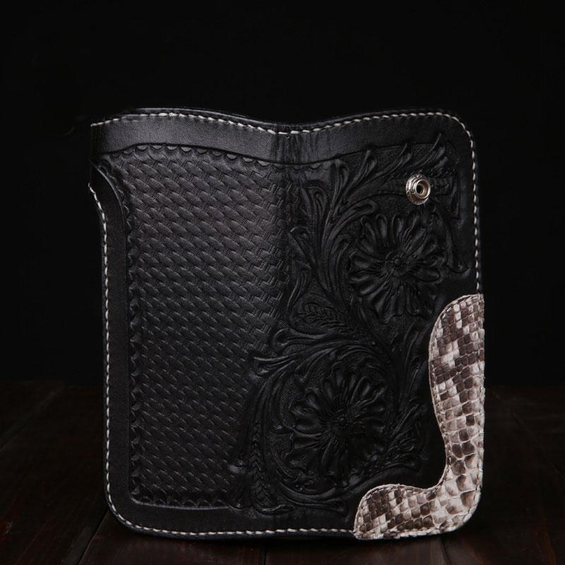 Handmade Leather Mens Cool Black Obsidian Chain Wallet Biker Trucker Wallet with Chain