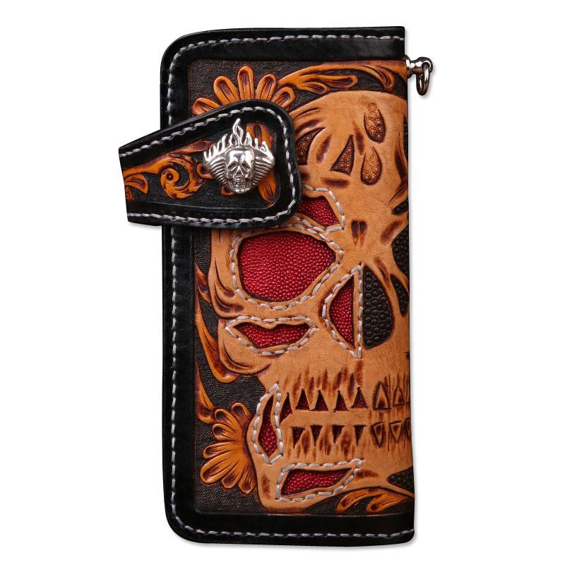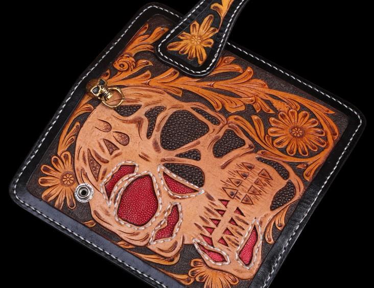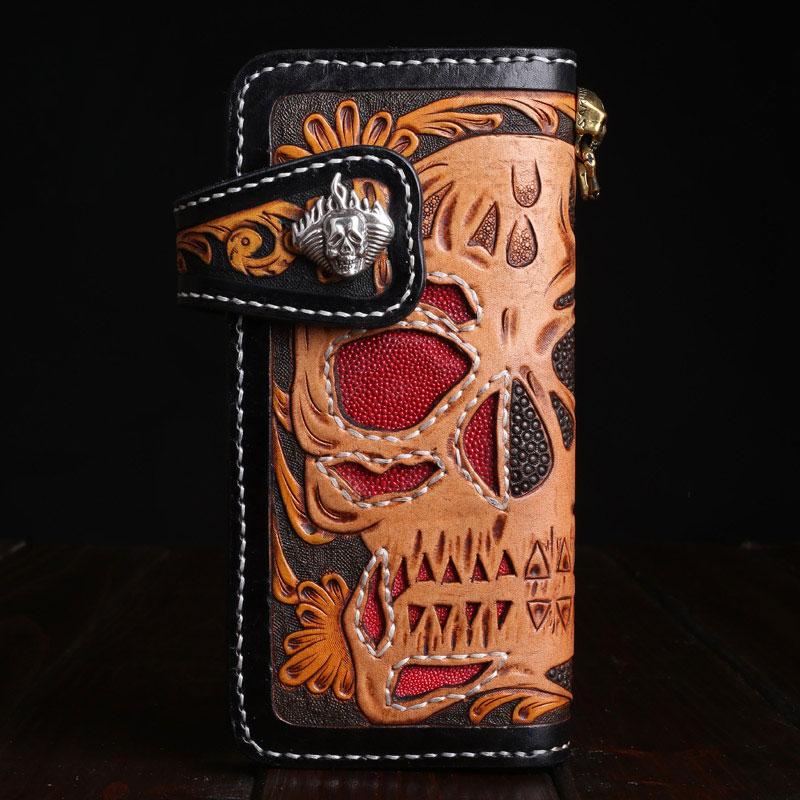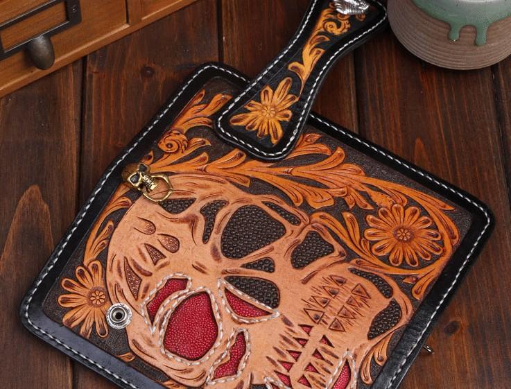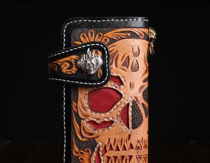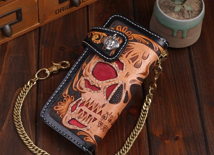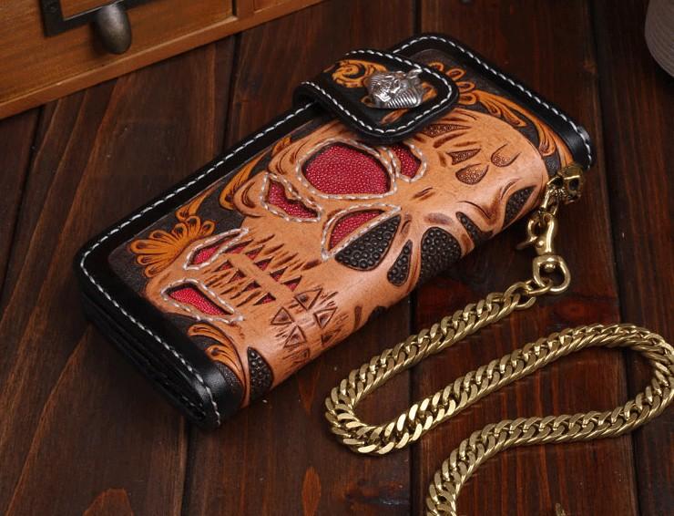Design: Handmade Leather Skull Mens Chain Biker Wallet Cool Leather Wallet Long Tooled Wallets for Men