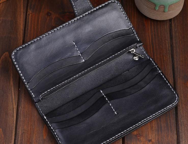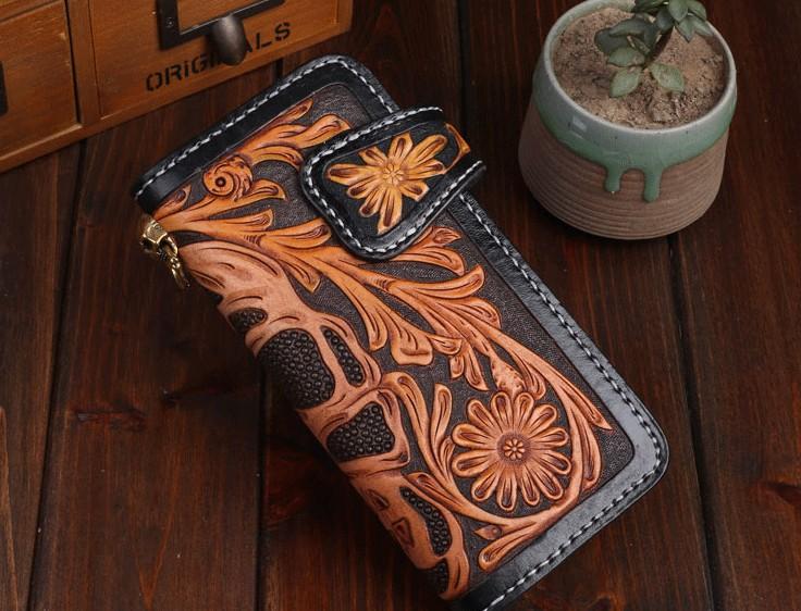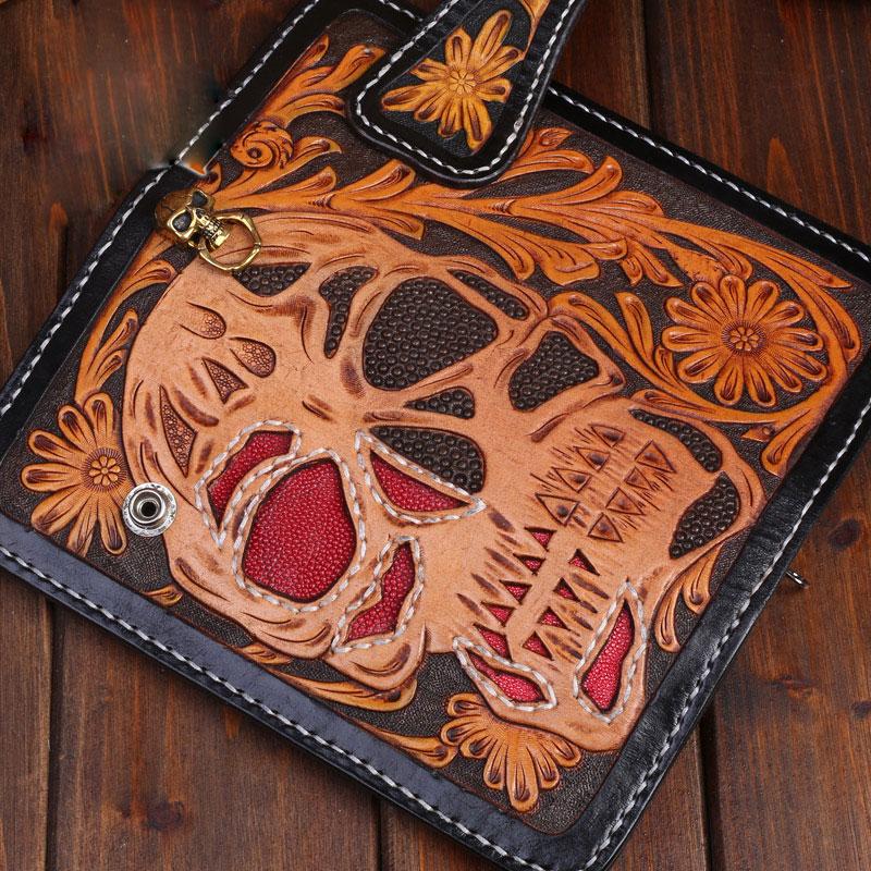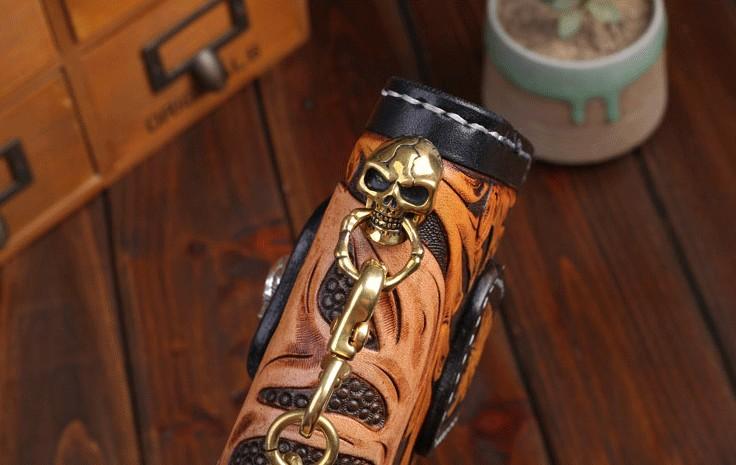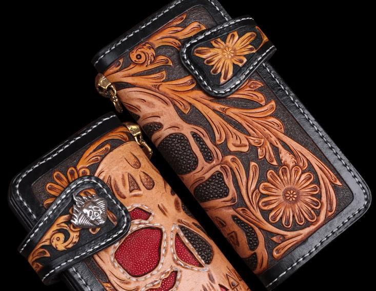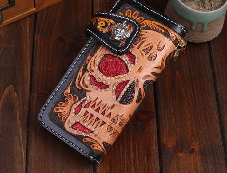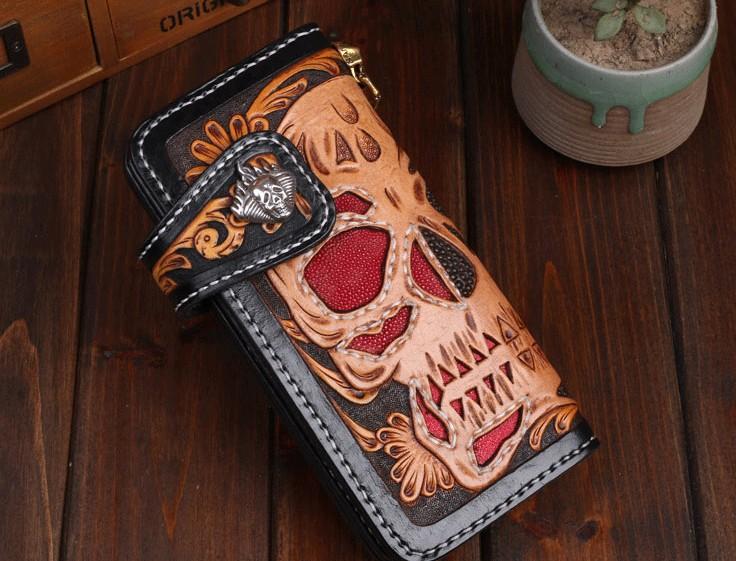 Design: Handmade Leather Skull Mens Chain Biker Wallet Cool Leather Wallet Long Tooled Wallets for Men