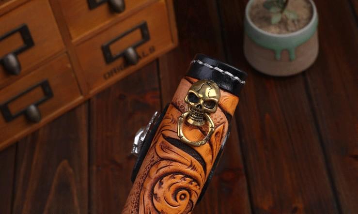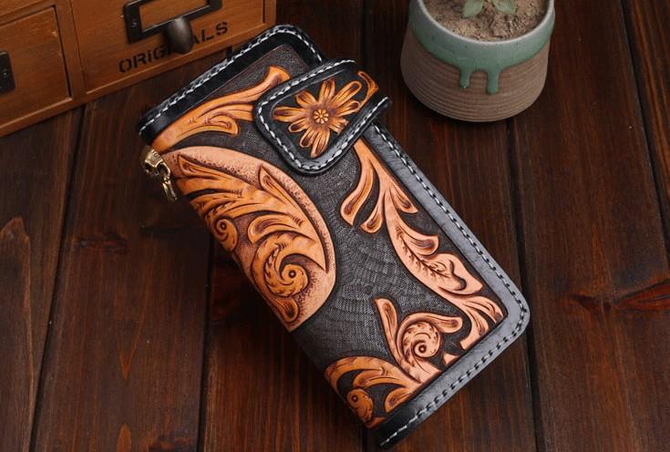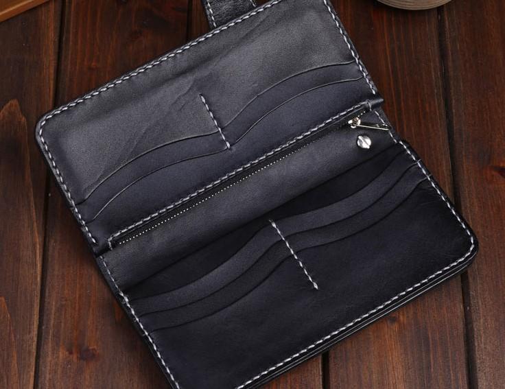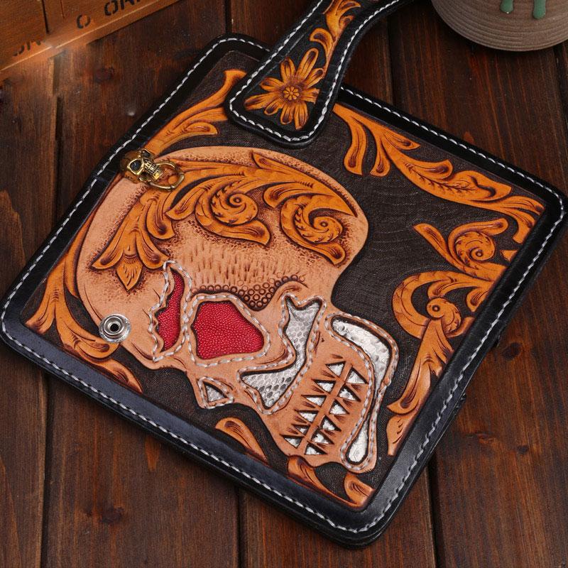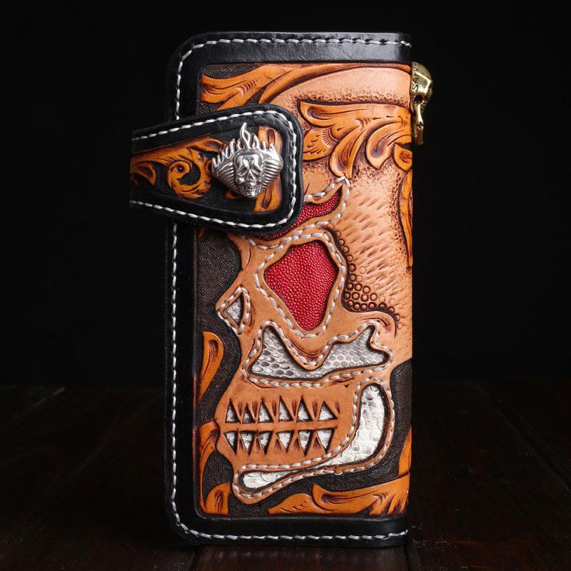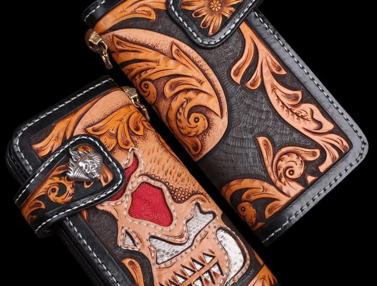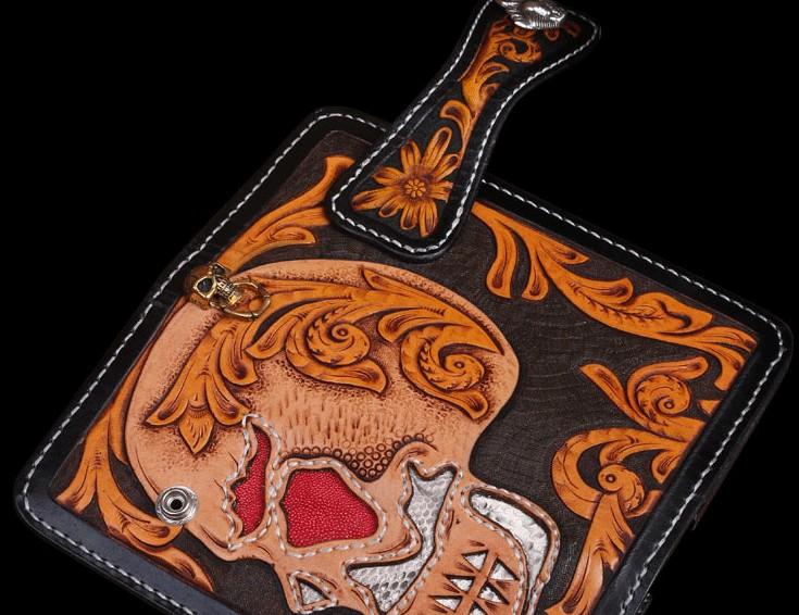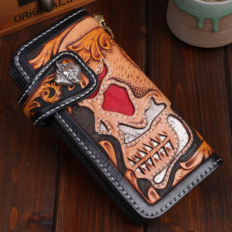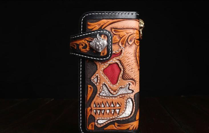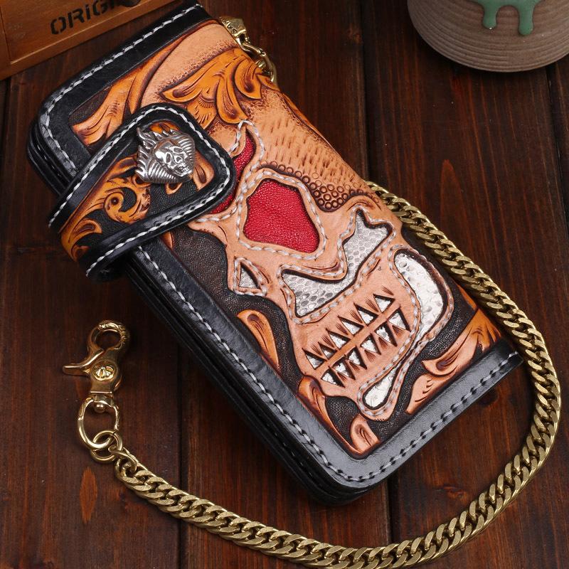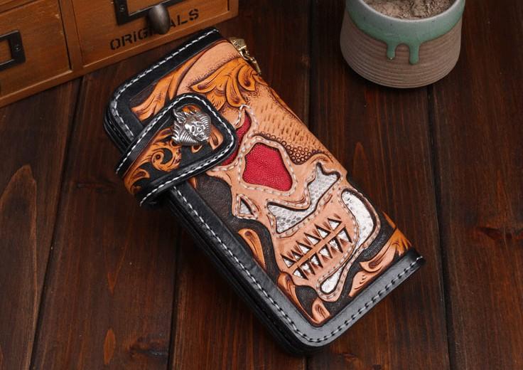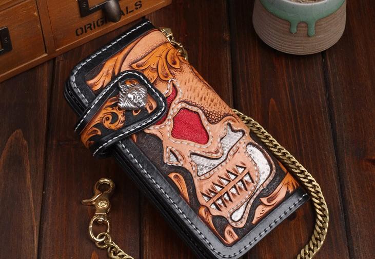 Design: Handmade Leather Skull Mens Chain Biker Wallet Cool Leather Wallet Long Tooled Wallets for Men
