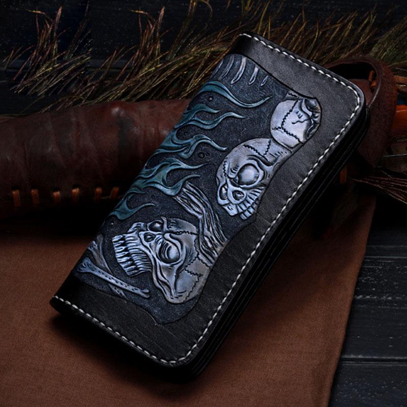 Handmade Leather Skull Tooled Mens Chain Biker Wallet Cool Leather Wallet With Chain Wallets for Men