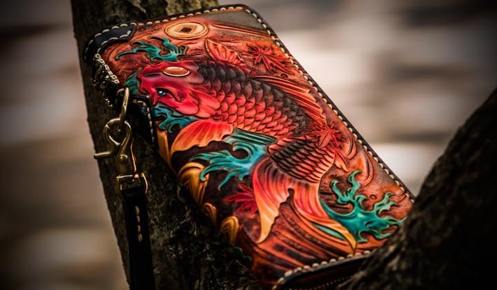 Style: Handmade Leather Tooled Carp Mens Chain Biker Wallet Cool Leather Wallet Long Phone Wallets for Men and it should last a life time