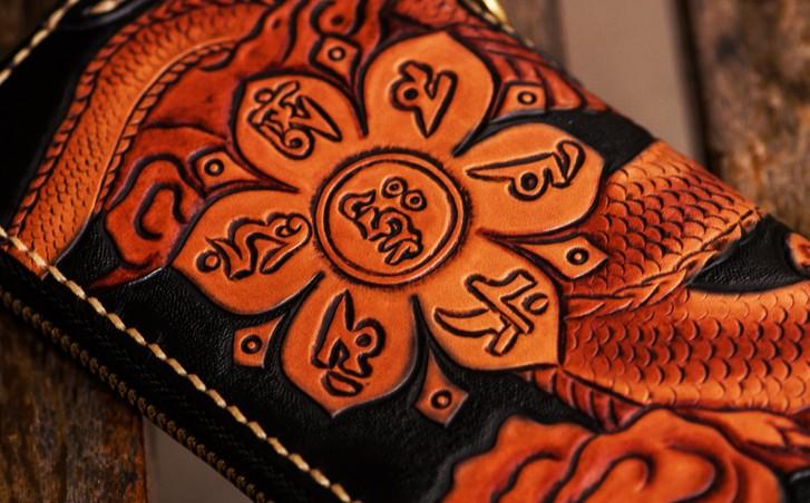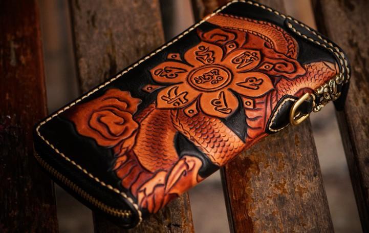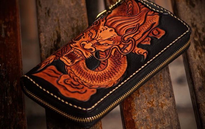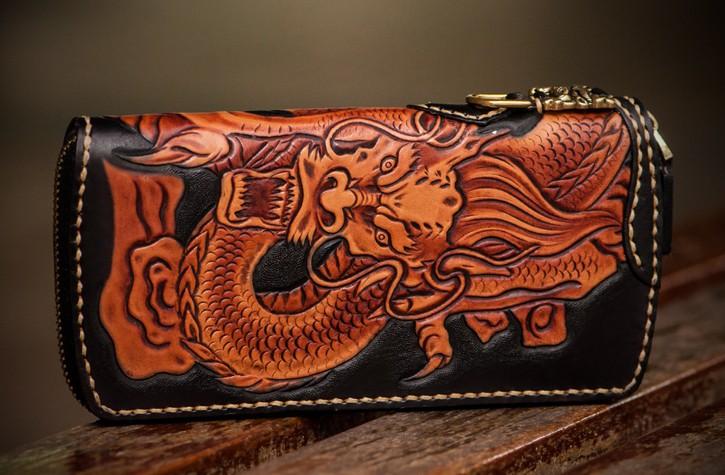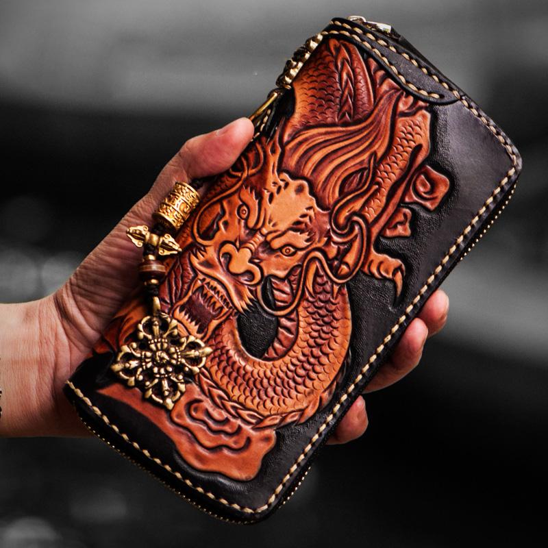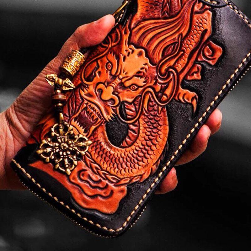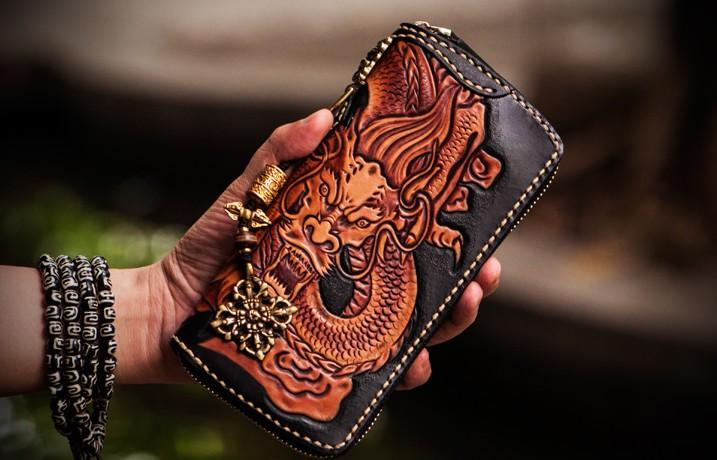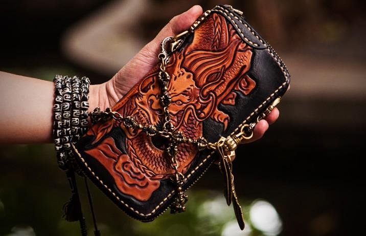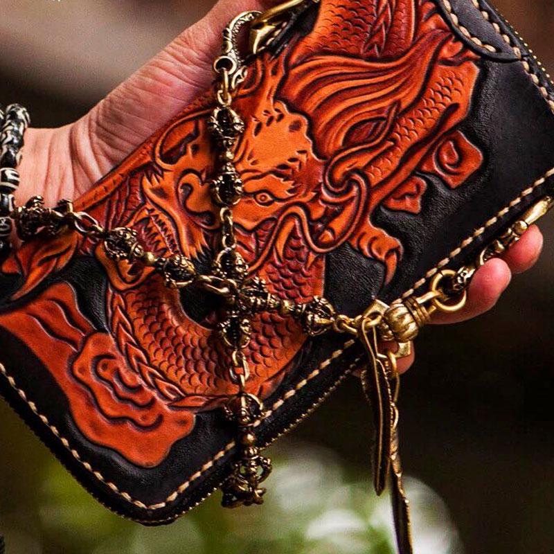 Design: Handmade Leather Tooled Chinese Dragon Mens Chain Biker Wallet Cool Leather Wallet Zipper Long Phone Wallets for Men