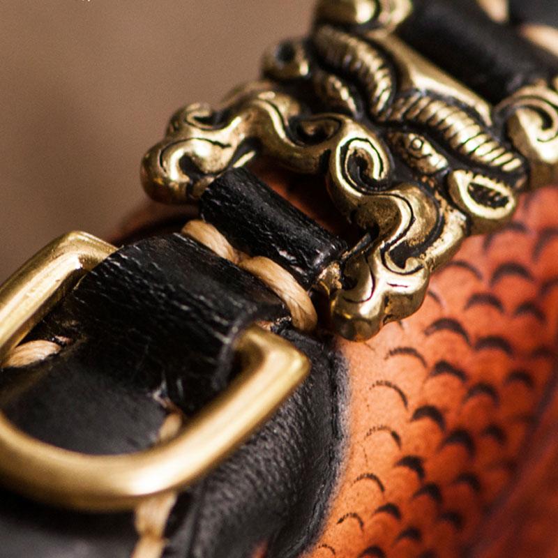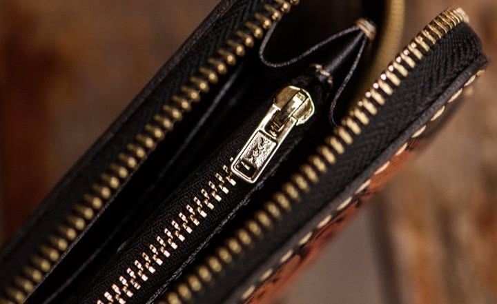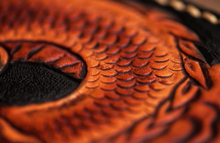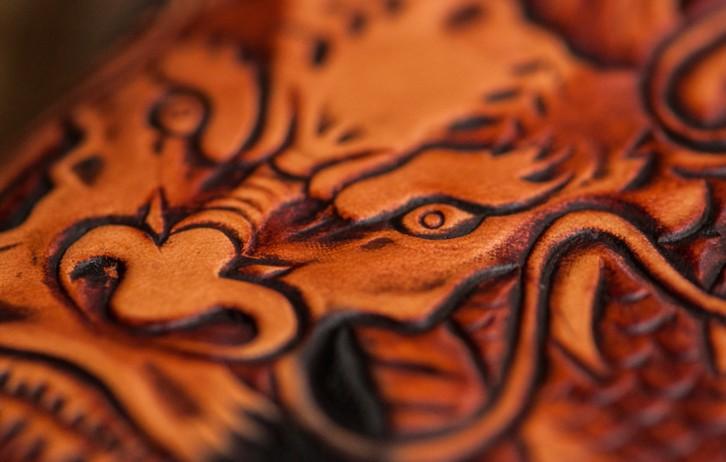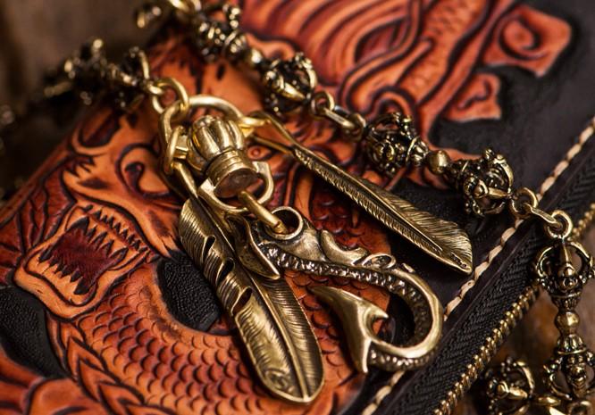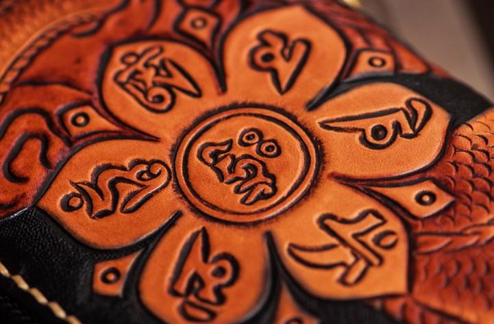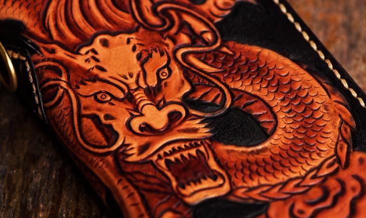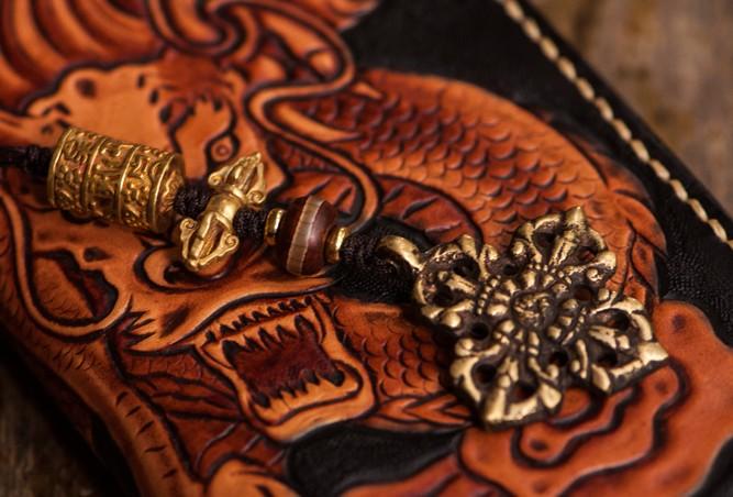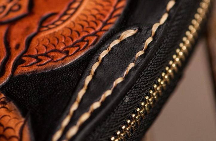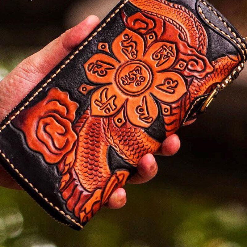 Design: Handmade Leather Tooled Chinese Dragon Mens Chain Biker Wallet Cool Leather Wallet Zipper Long Phone Wallets for Men