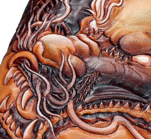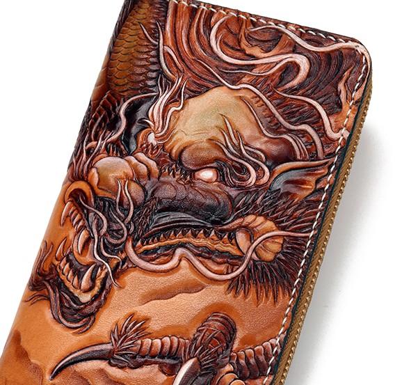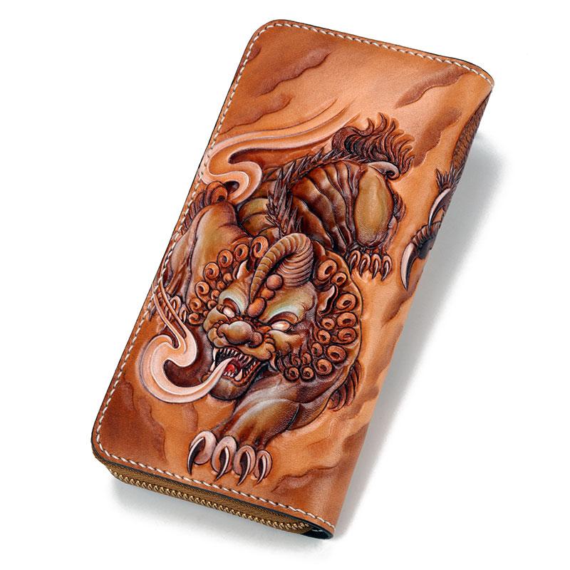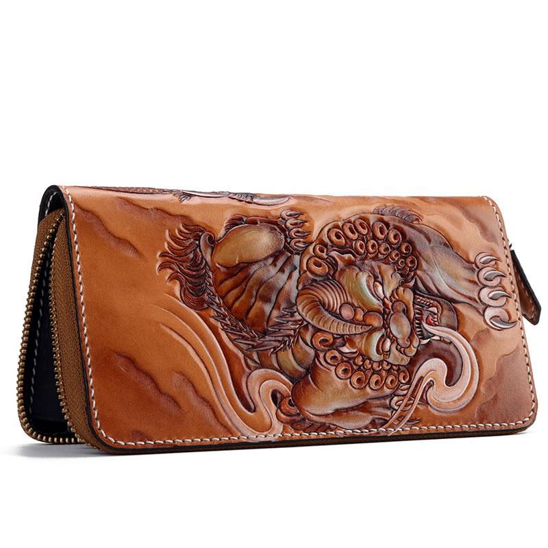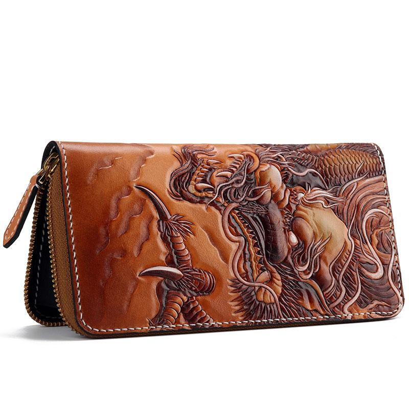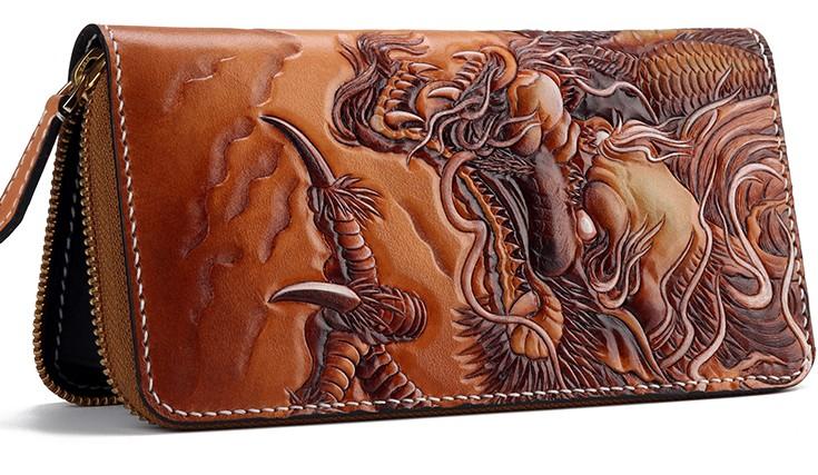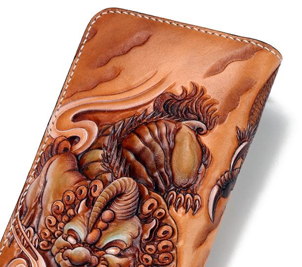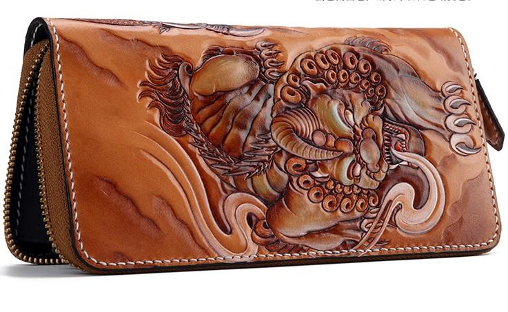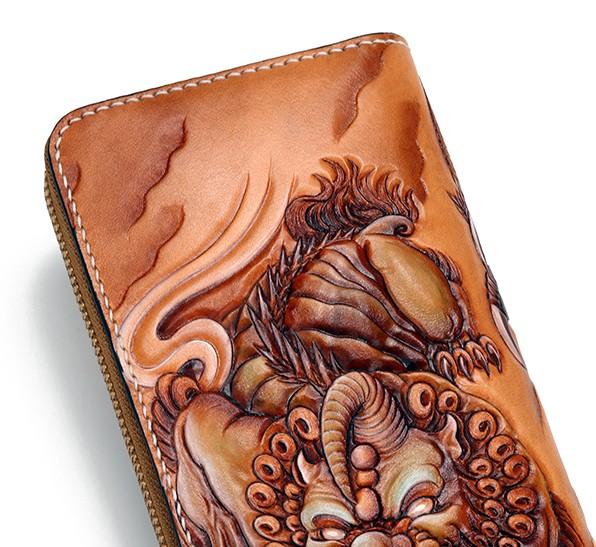 Design: Handmade Leather Tooled Chinese Dragon Tiger Mens Chain Biker Wallet Cool Leather Wallet Zipper Long Phone Wallets for Men