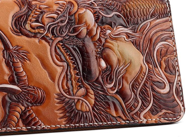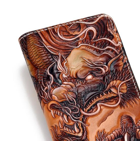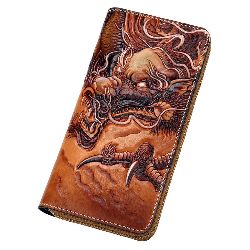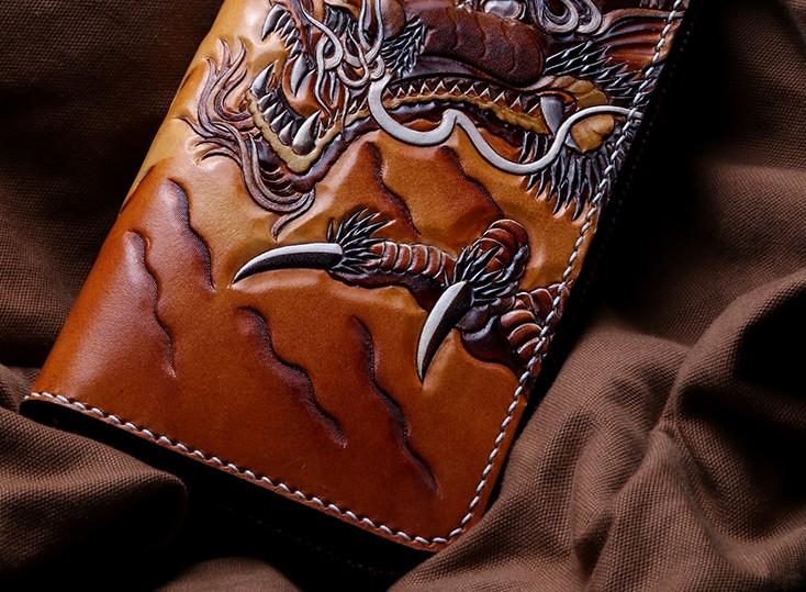 Handmade Leather Tooled Chinese Dragon Tiger Mens Chain Biker Wallet Cool Leather Wallet Zipper Long Phone Wallets for Men