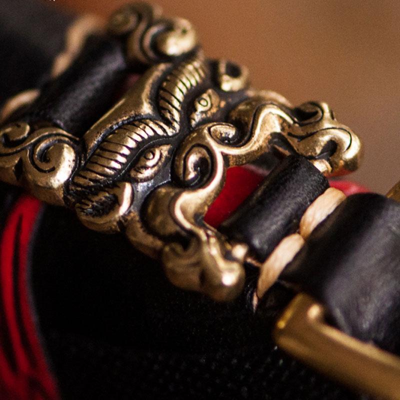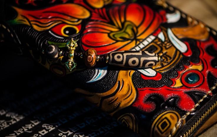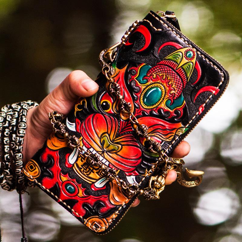 Design: Handmade Leather Tooled Chinese Monster Mens Chain Biker Wallet Cool Leather Wallet Zipper Long Phone Wallets for Men