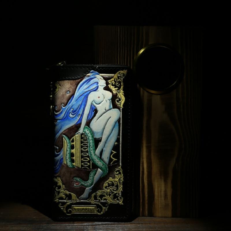 Style: Handmade Leather Tooled Constellation Aquarius Biker Wallet Mens Cool Chain Wallet Trucker Wallet with Chain