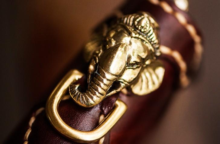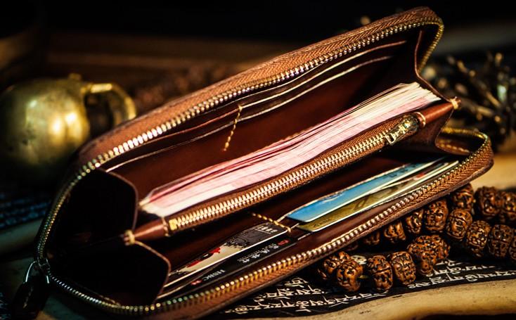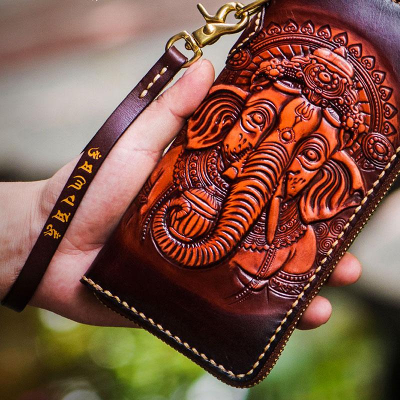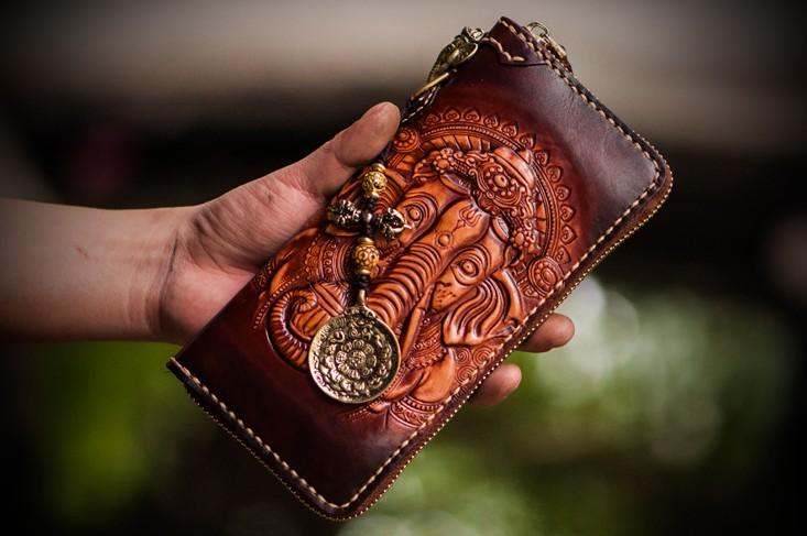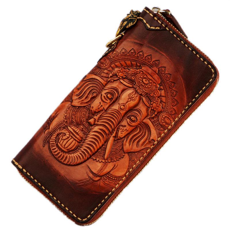 Style: Handmade Leather Tooled Ganesh Mens Chain Biker Wallet Cool Leather Wallet Zipper Long Phone Wallets for Men