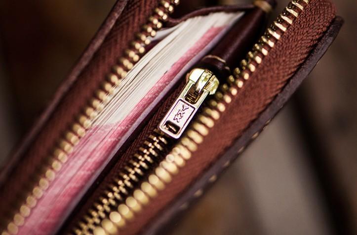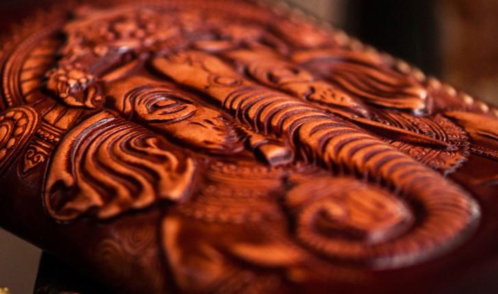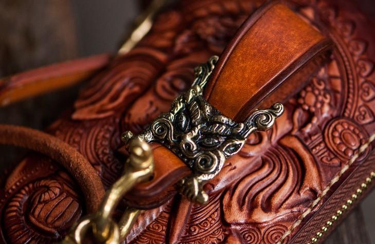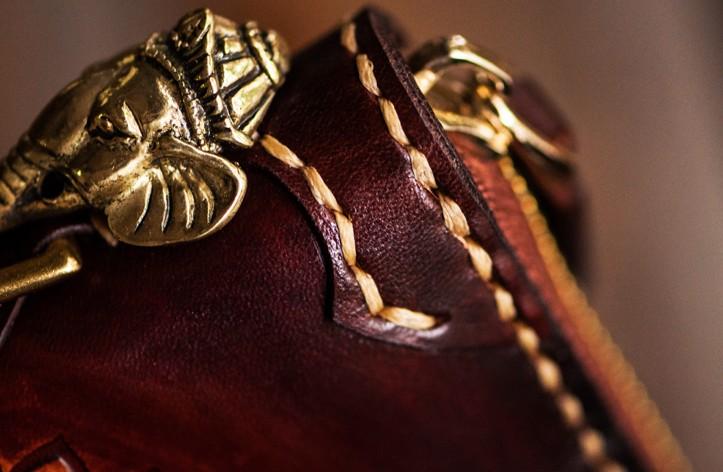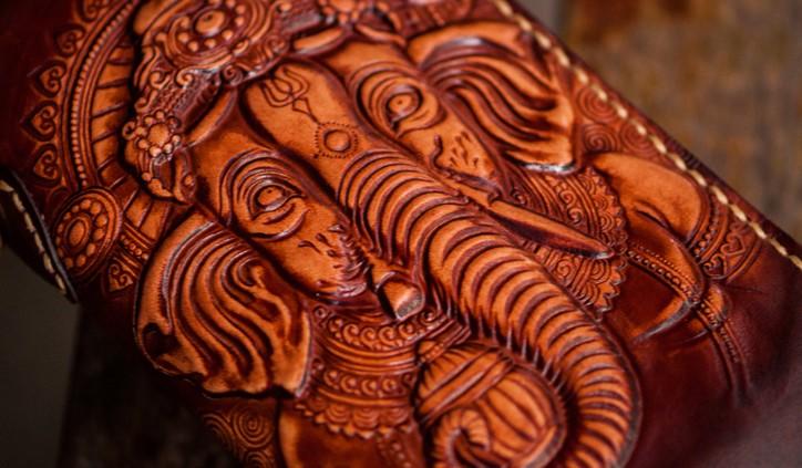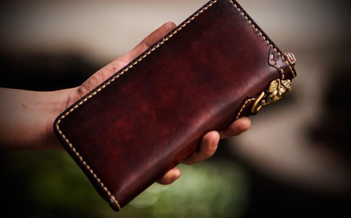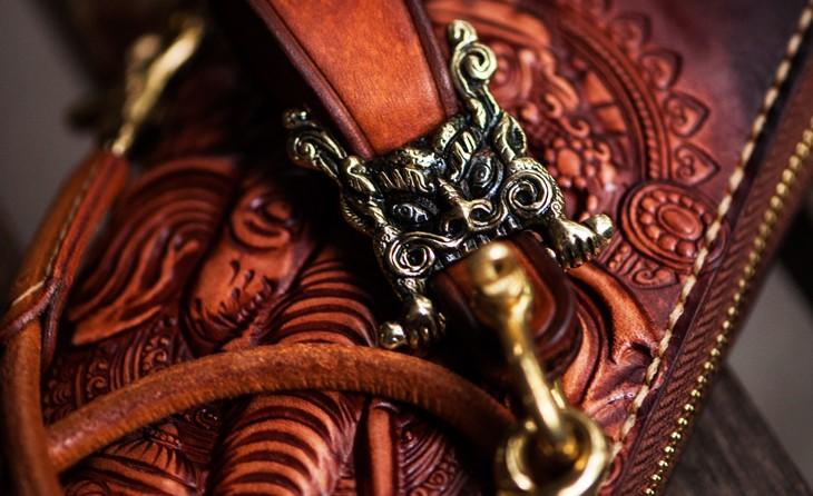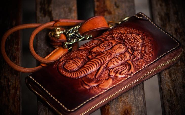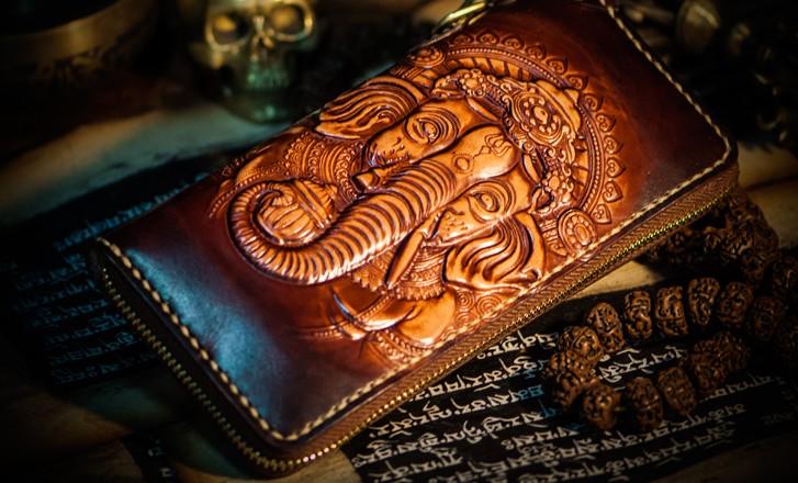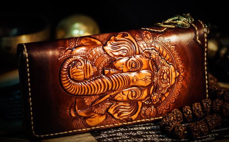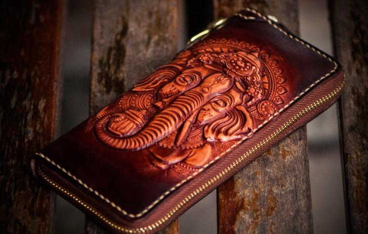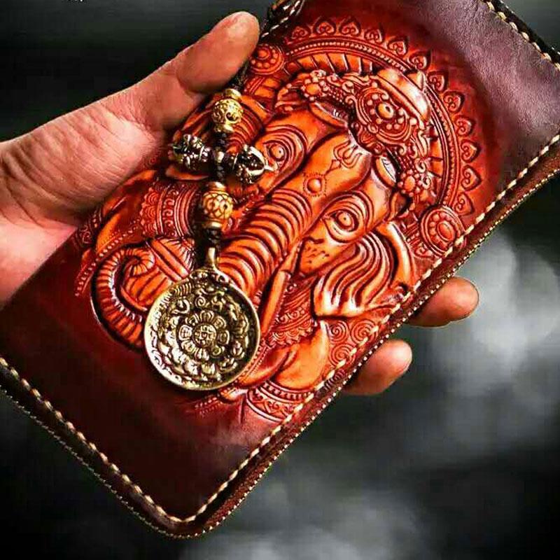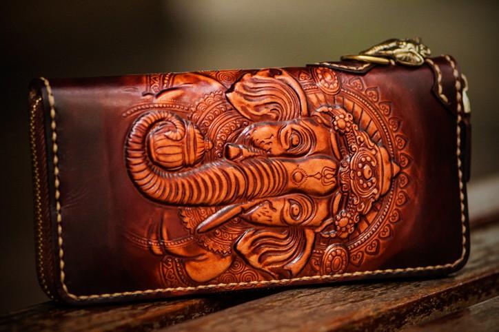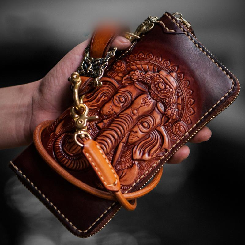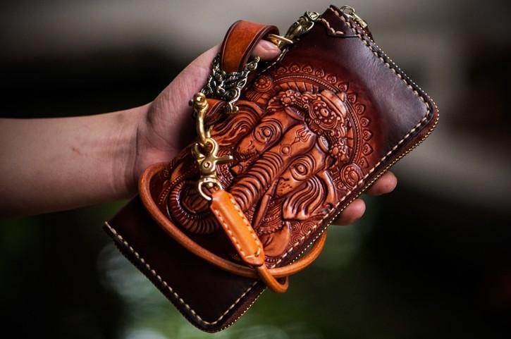 Design: Handmade Leather Tooled Ganesh Mens Chain Biker Wallet Cool Leather Wallet Zipper Long Phone Wallets for Men