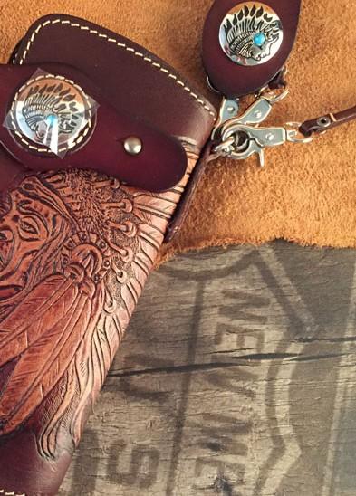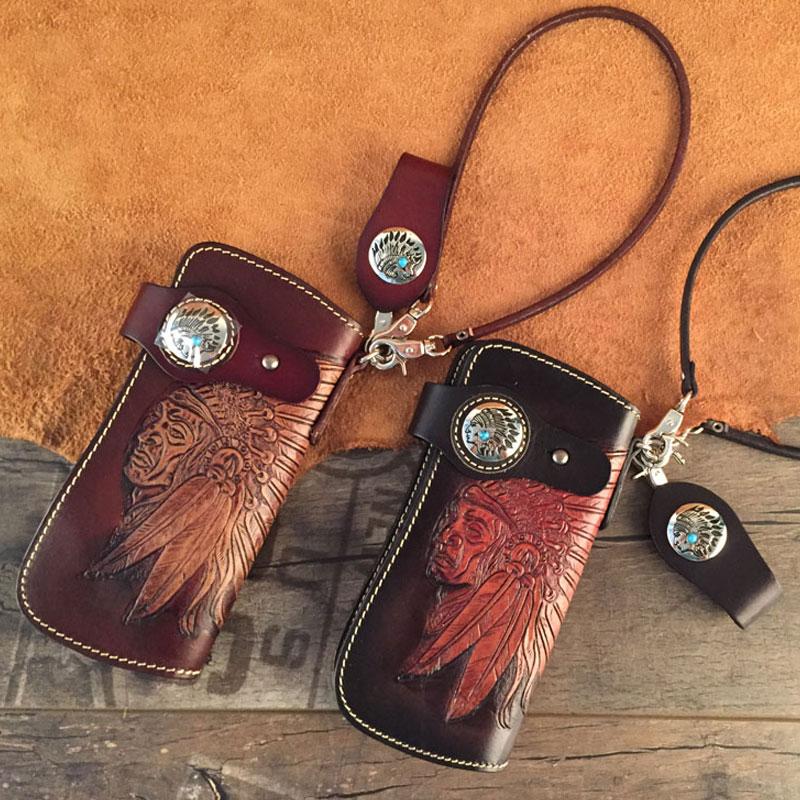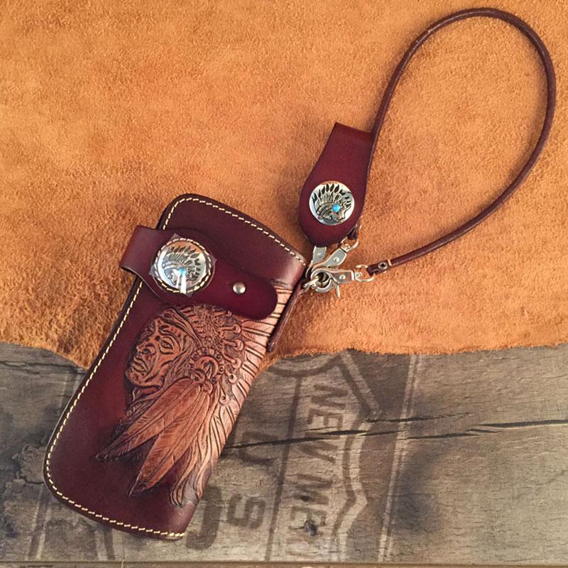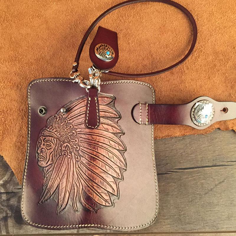 Style: Handmade Leather Tooled Indian Chief Mens Chain Biker Wallet Cool Leather Wallet Long Wallet for Men
