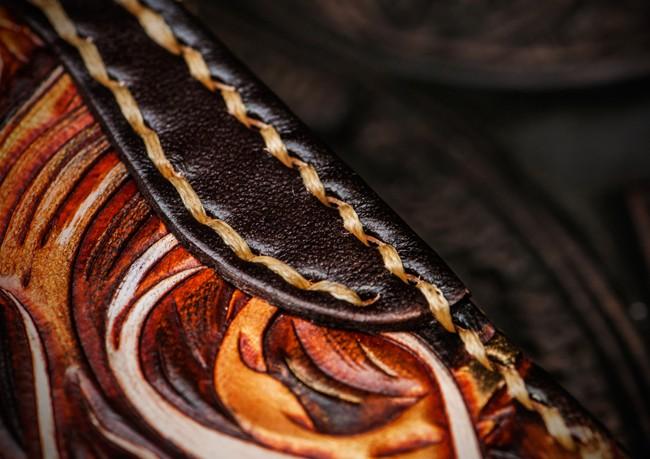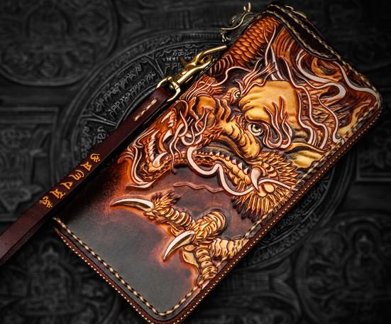Style: Handmade Leather Tooled Long Chinese Dragon Mens Chain Biker Wallet Cool Leather Wallet With Chain Wallets for Men