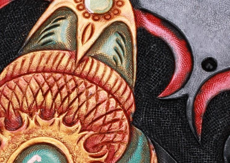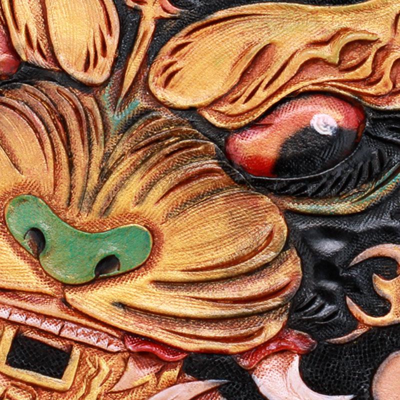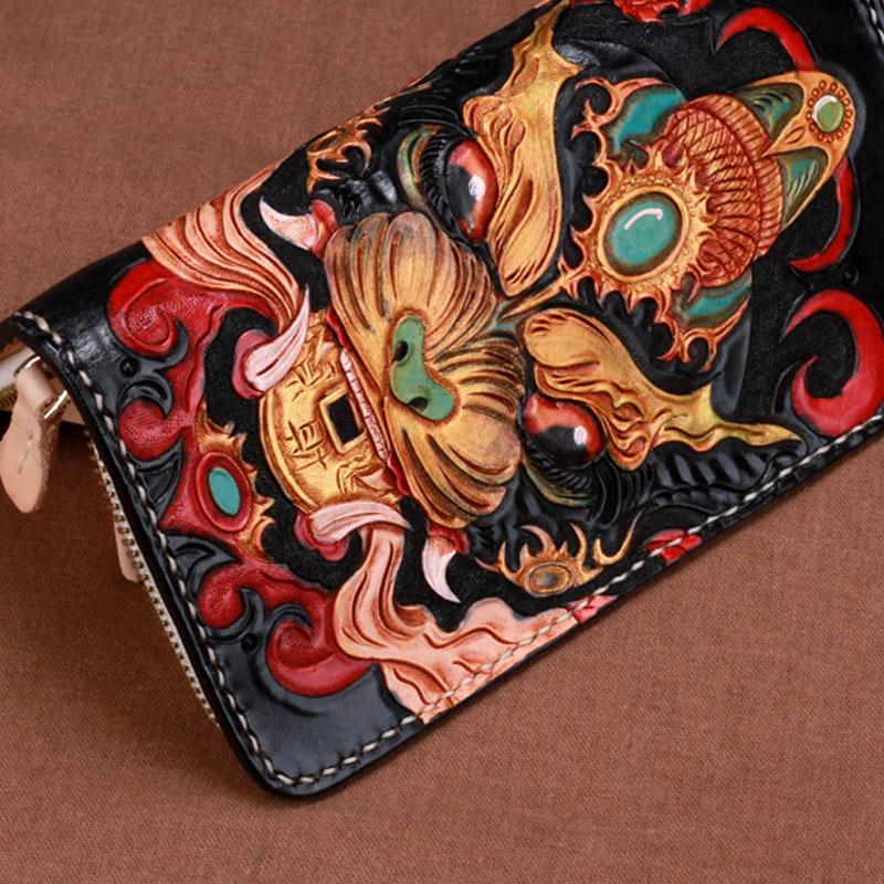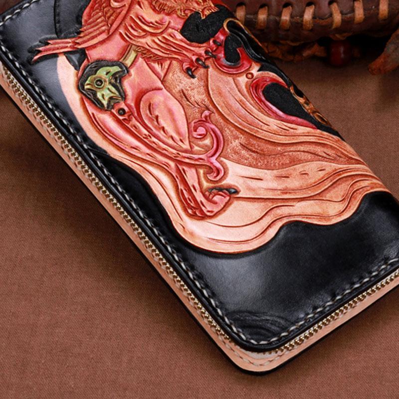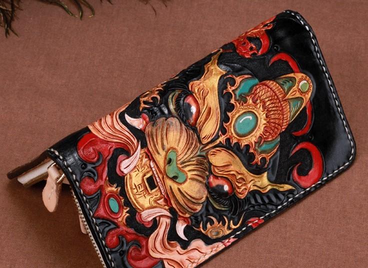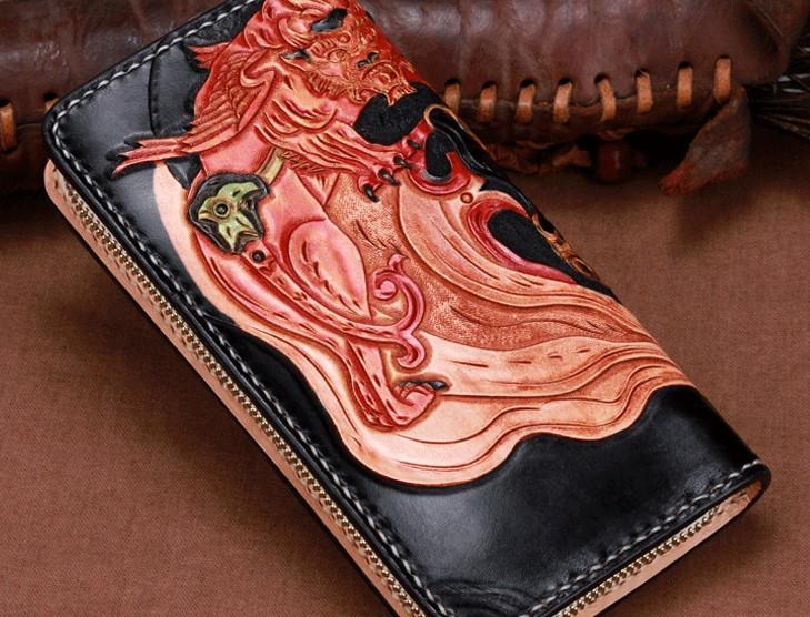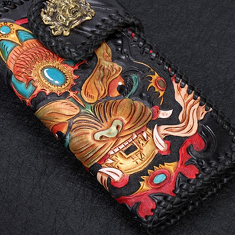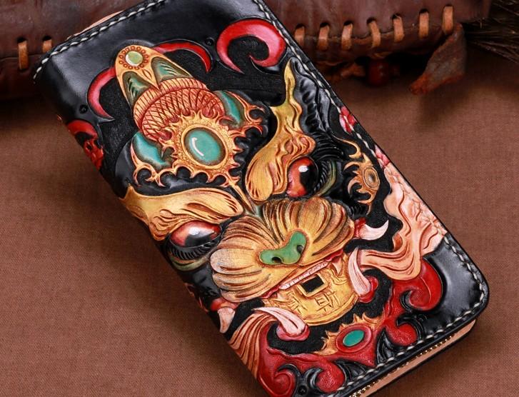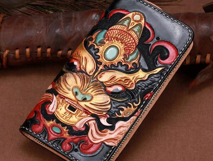 Design: Handmade Leather Tooled Monster Mens Chain Biker Wallet Cool Leather Wallet Zipper Long Phone Wallets for Men