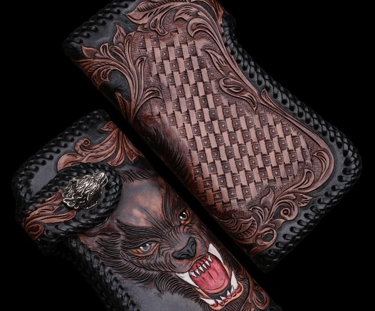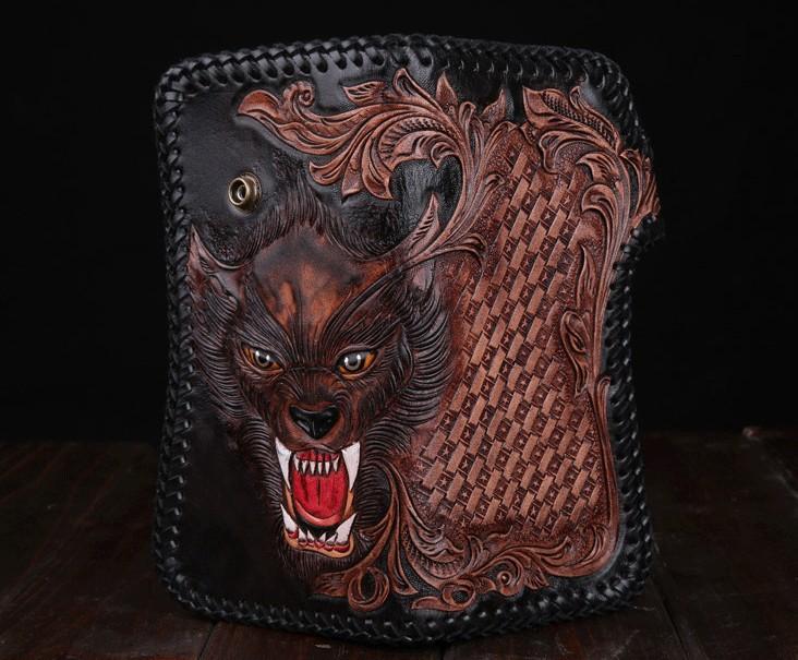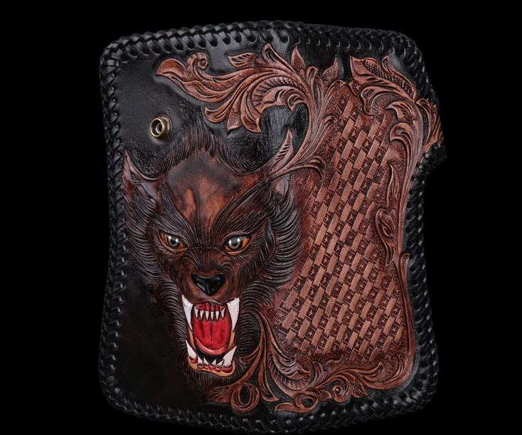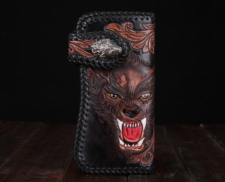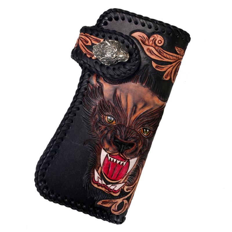 Design: Handmade Leather Wolf Mens Chain Biker Wallet Cool Leather Wallet Long Phone Wallets for Men