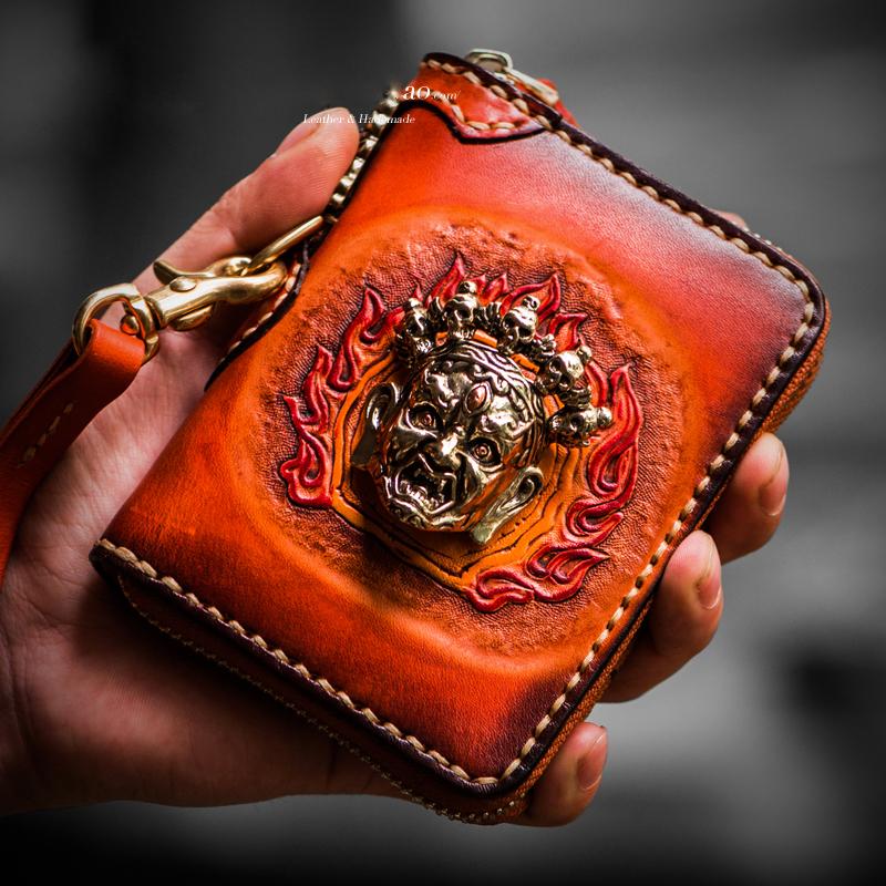 Handmade Mahākāla Leather Brown Biker Wallet Mens Cool Short Chain Wallet Trucker Wallet with Chain