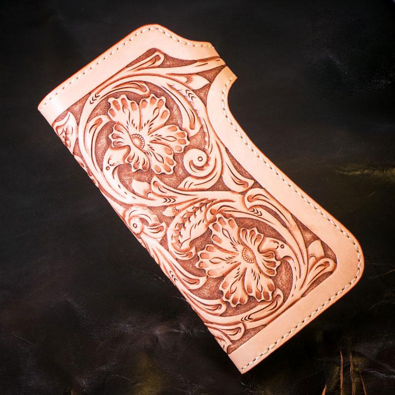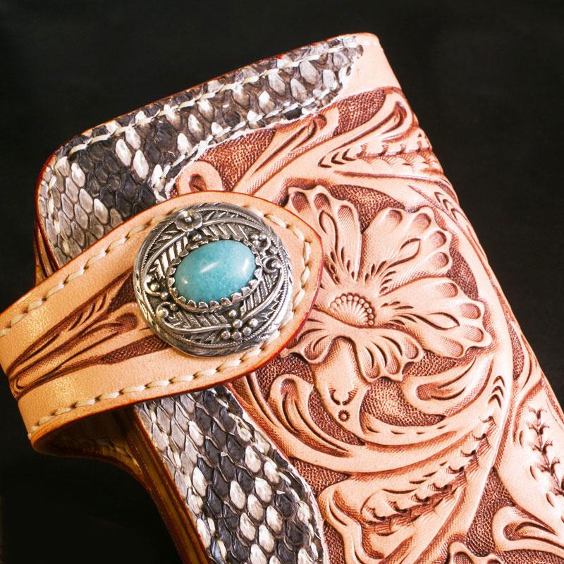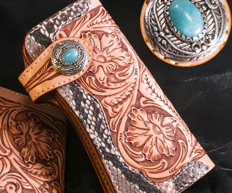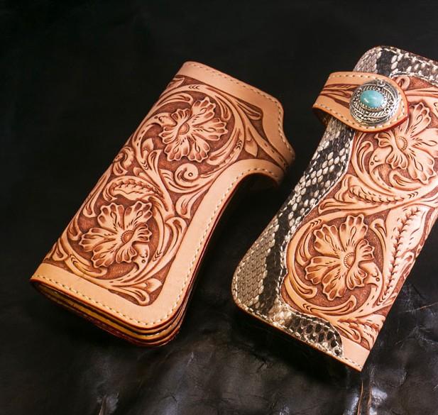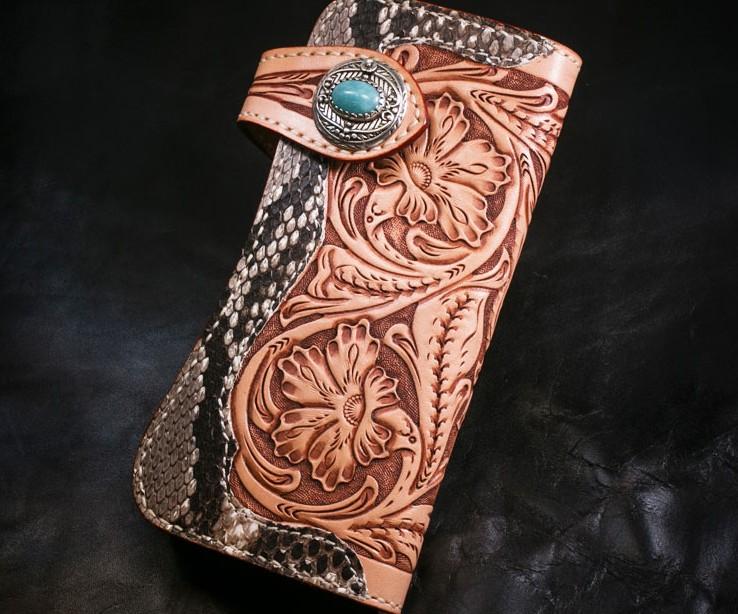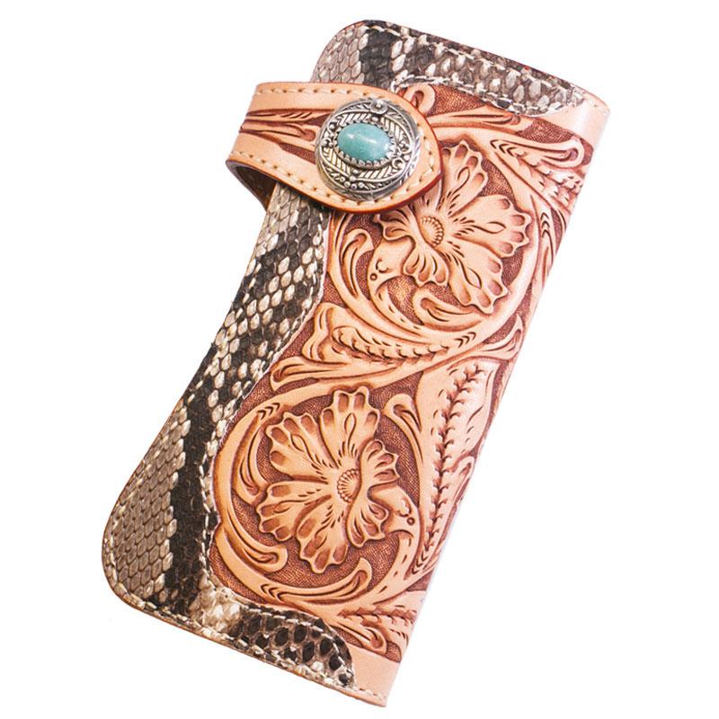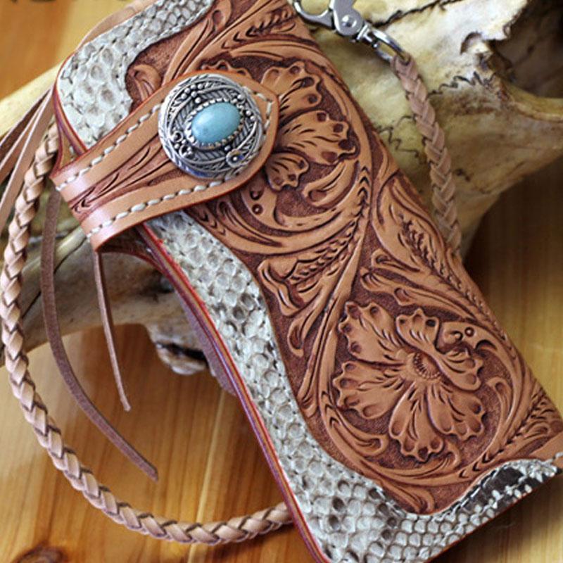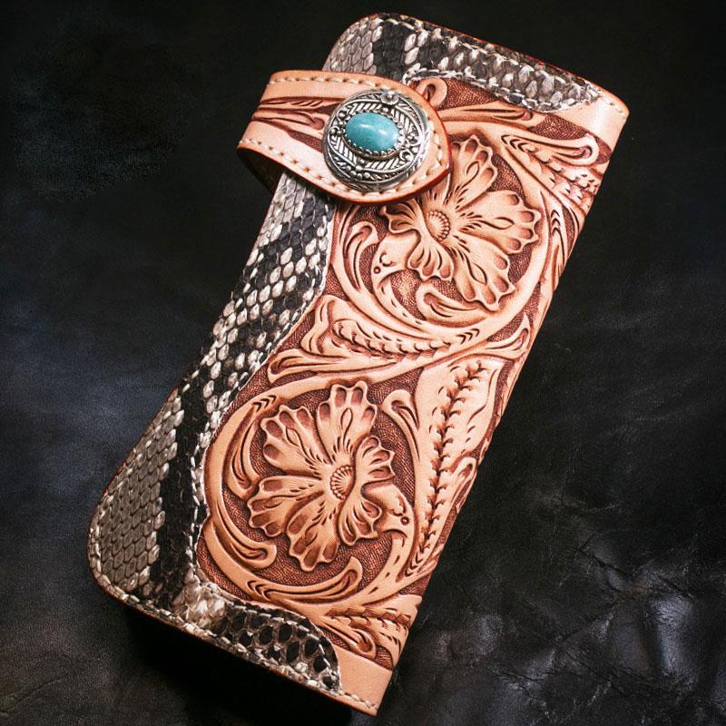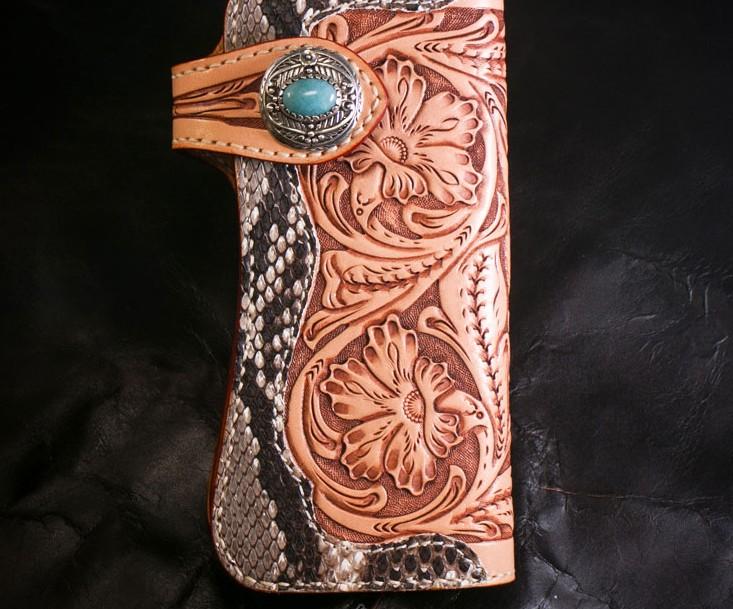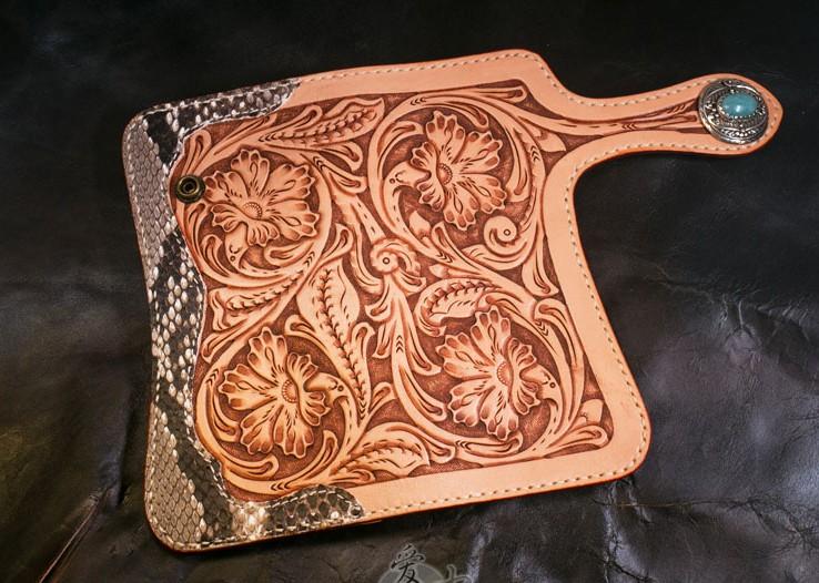 Style: Handmade Mens Cool Tooled Boa Skin Floral Leather Chain Wallet Biker Trucker Wallet with Chain