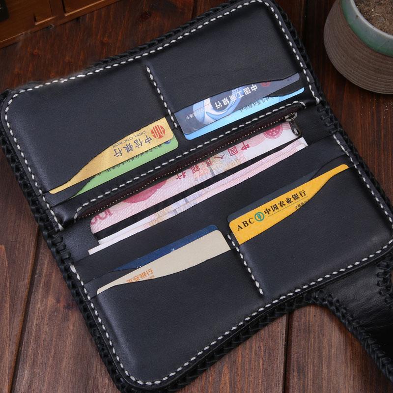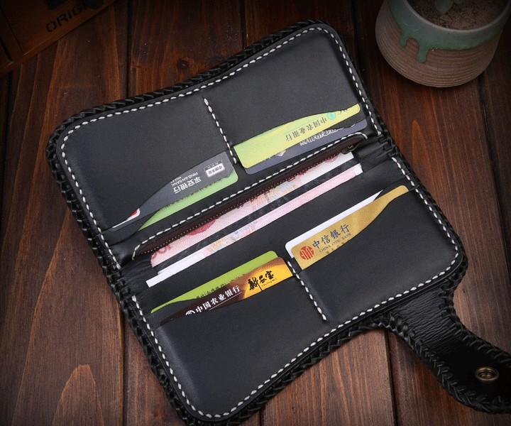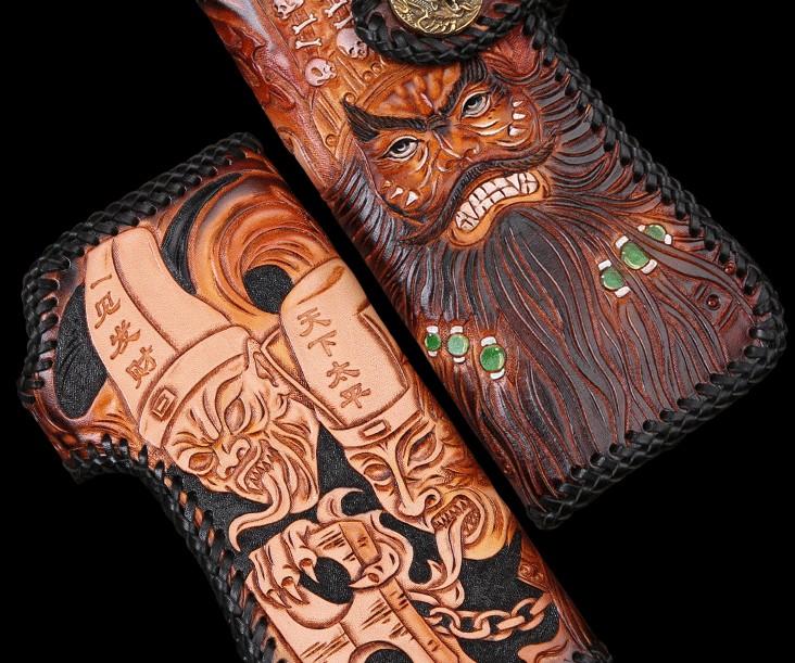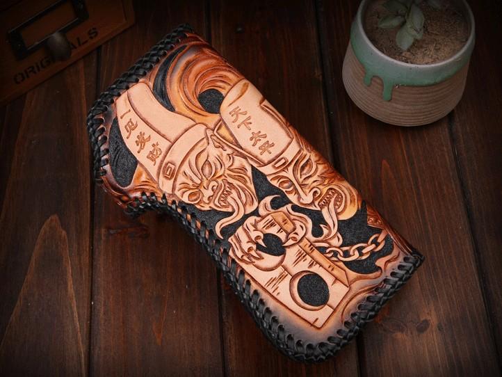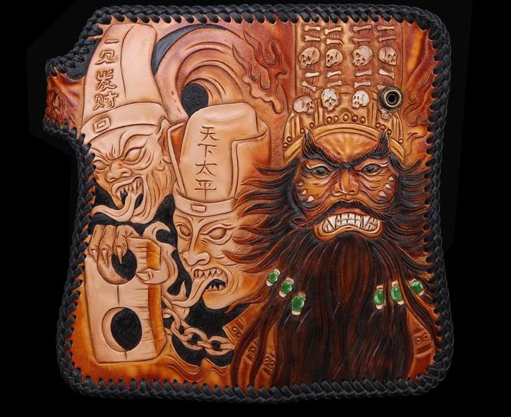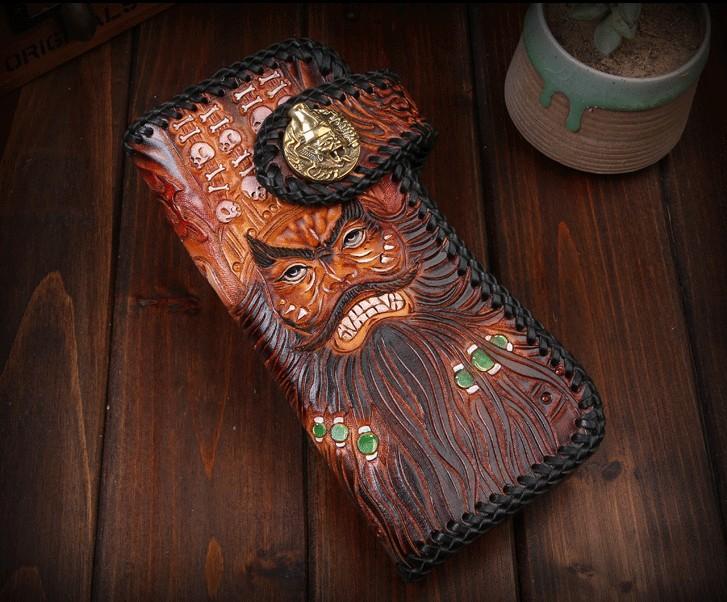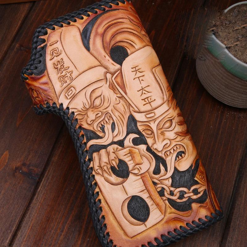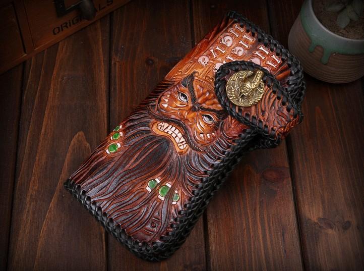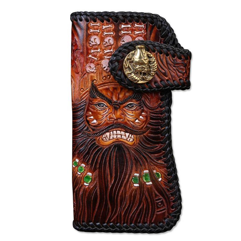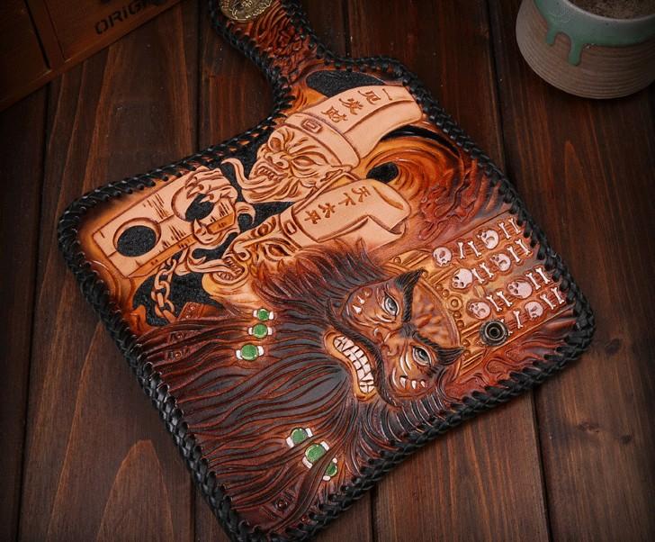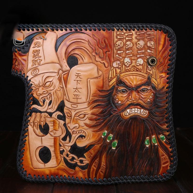 Design: Handmade Mens Cool Tooled Zhong Kui demon Leather Chain Wallet Biker Trucker Wallet with Chain