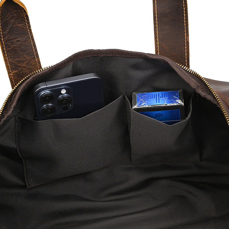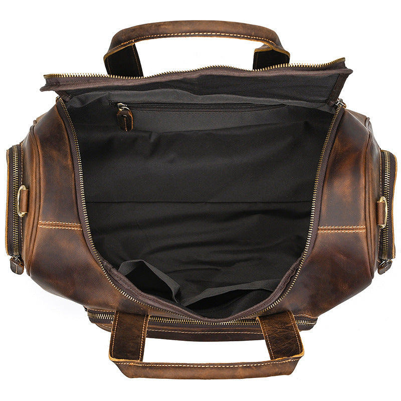 The Small Leather Weekender Bag for Men proves that great things come in compact packages. Despite its smaller size compared to traditional weekend bags, it offers ample space for essentials while maintaining a sleek, manageable profile. The rich crazy horse leather not only provides exceptional durability but also develops a unique character with each use, making this Long Weekend Shoulder Bag a personal companion that grows more distinctive over time.