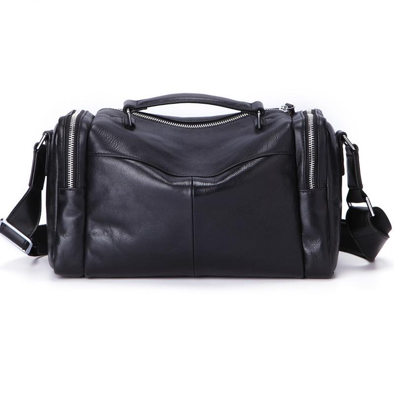 Design: Fashion Black Leather Men's Small Barrel Side Bag Travel Bag Small Black Overnight Bag For Men