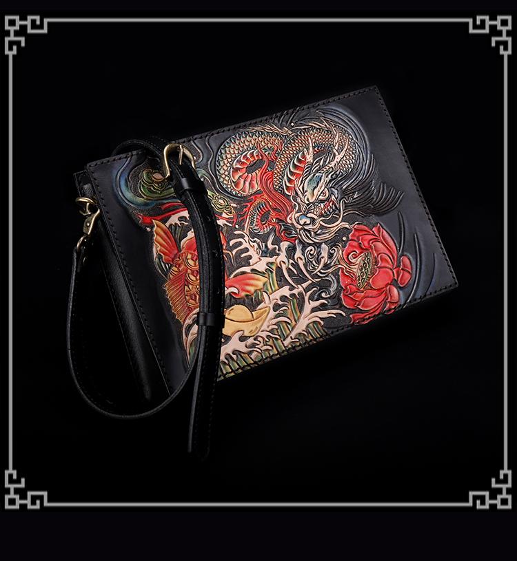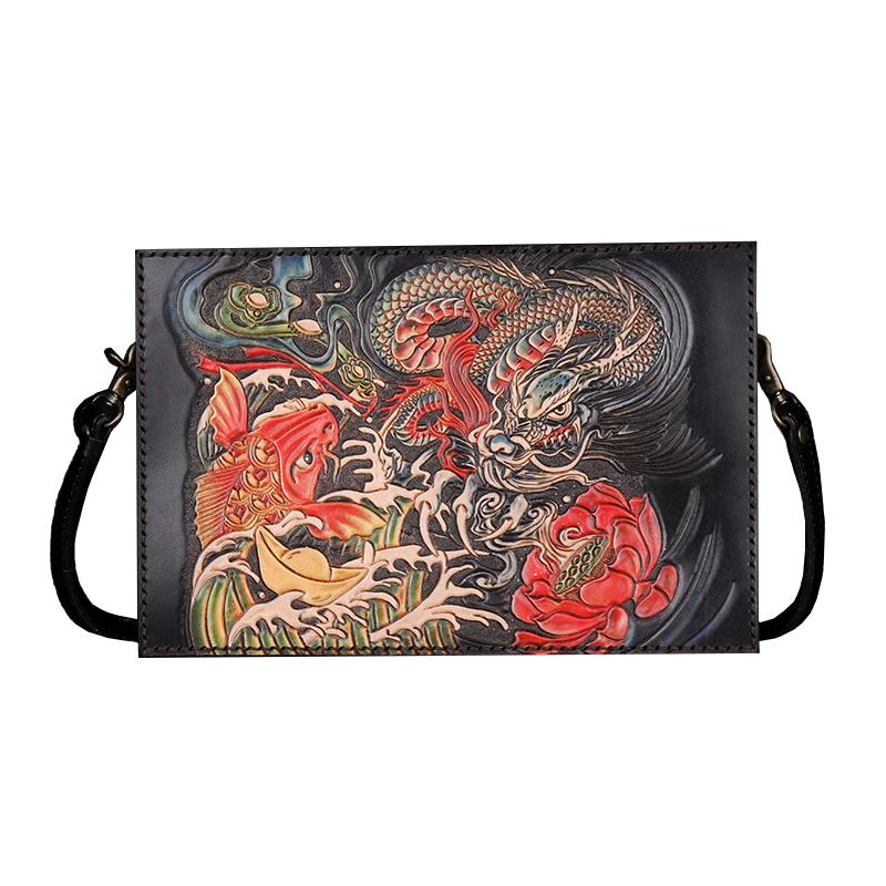 Style: Handmade Black Tooled Dragon Carp Leather Messenger Bag Side Bag Clutch Wristlet Bag For Men