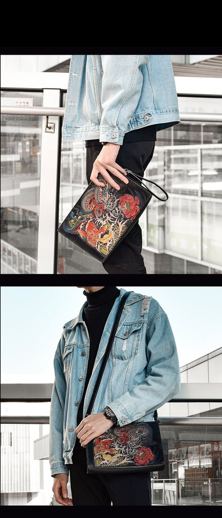 Design: Handmade Black Tooled Dragon Carp Leather Messenger Bag Side Bag Clutch Wristlet Bag For Men