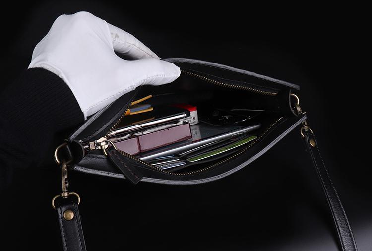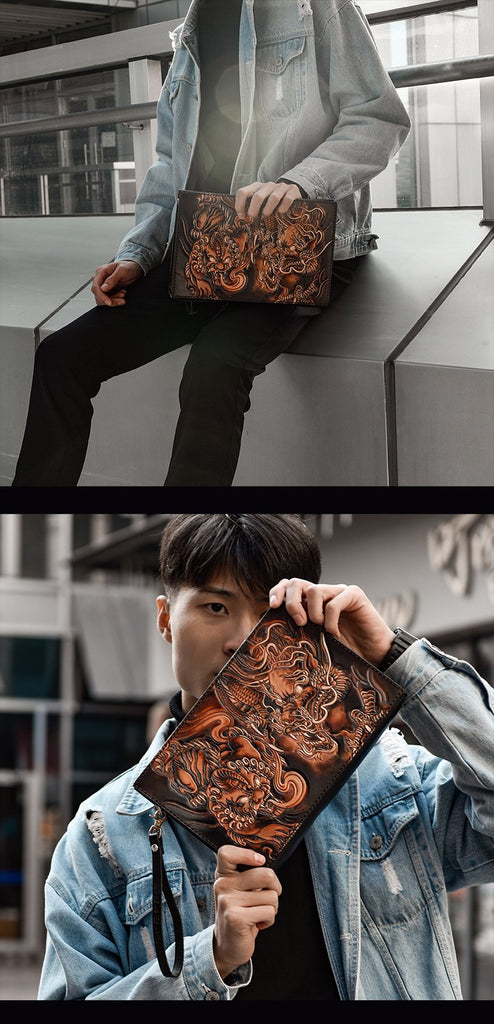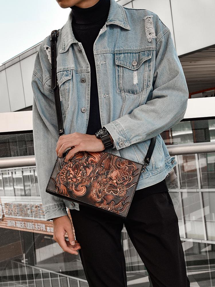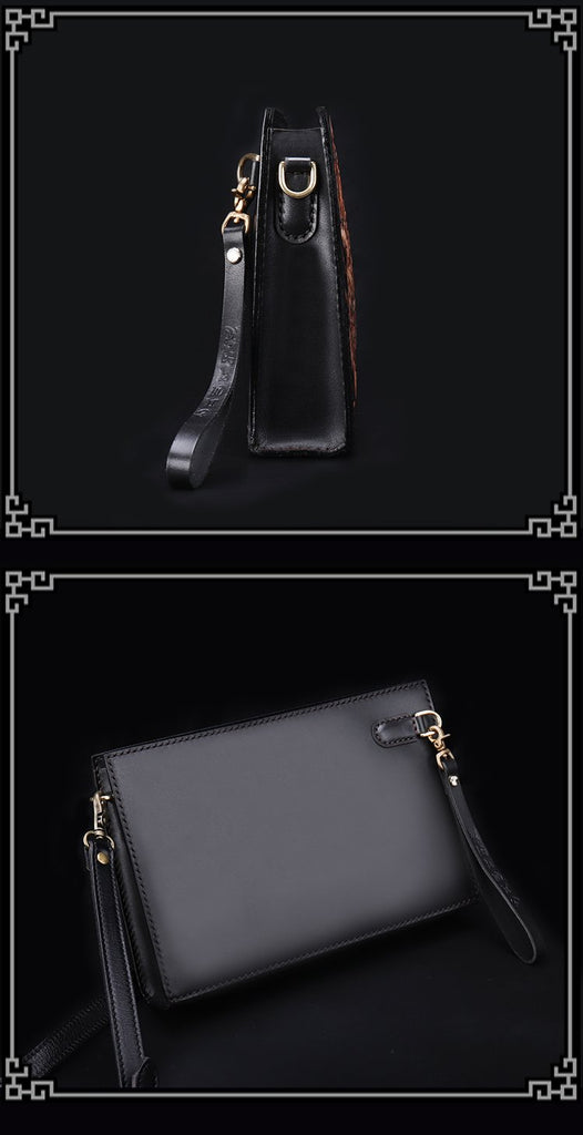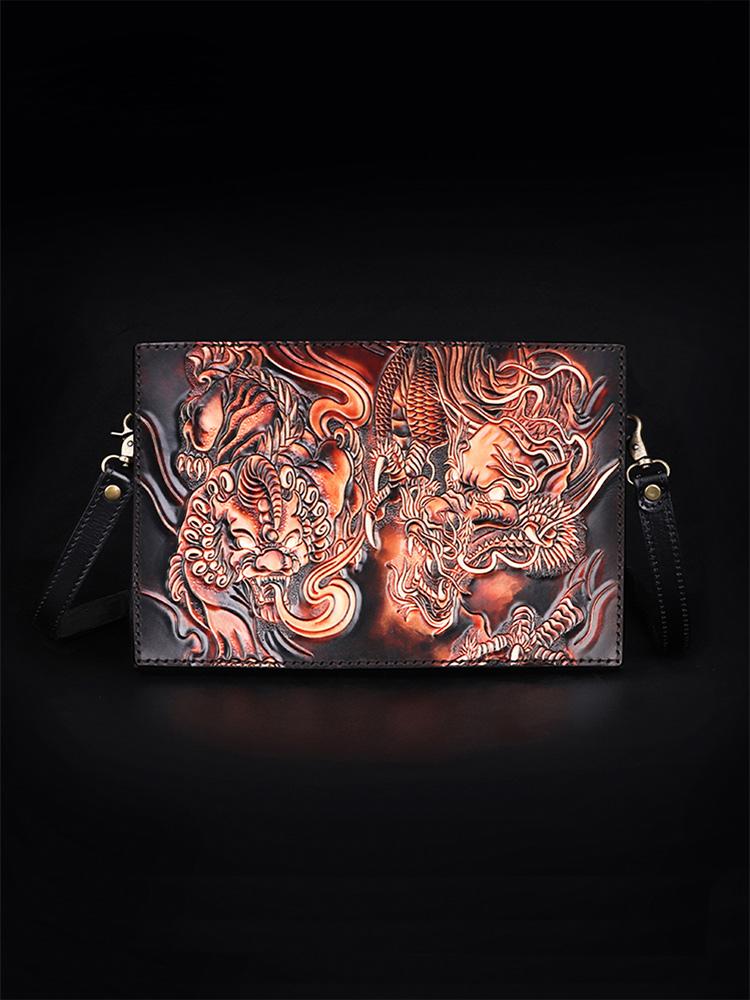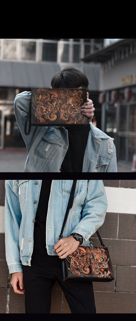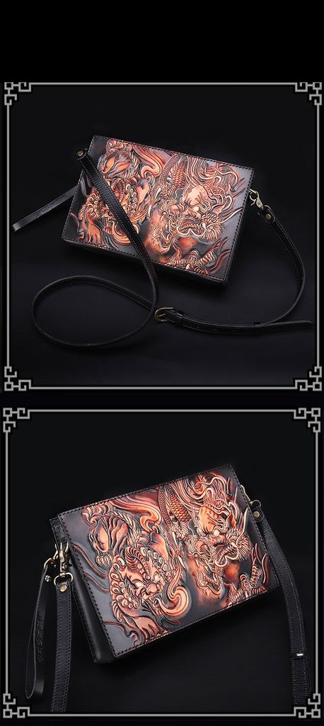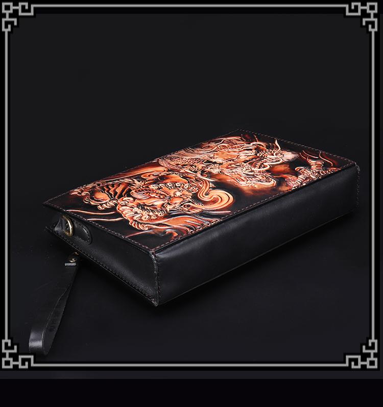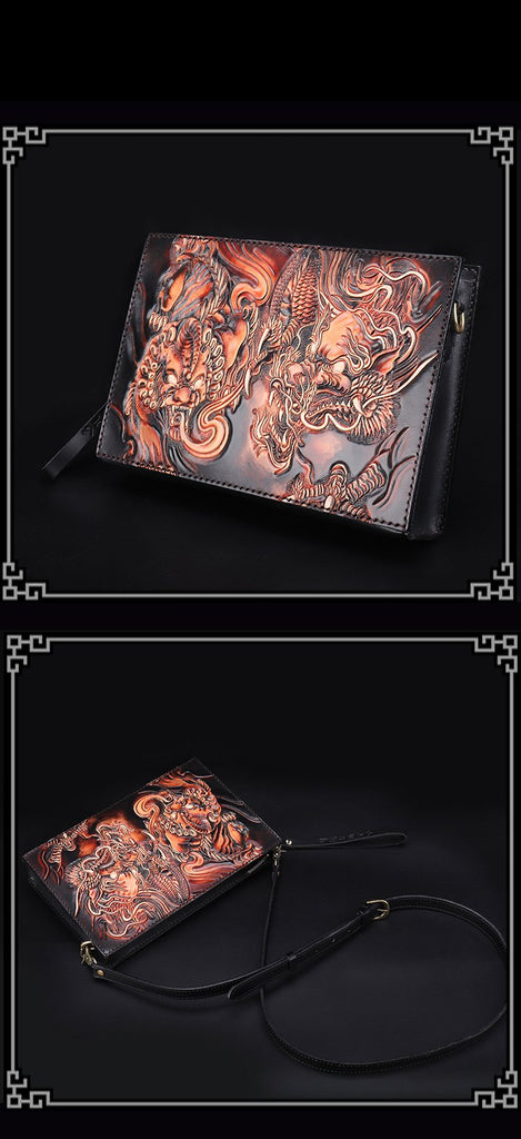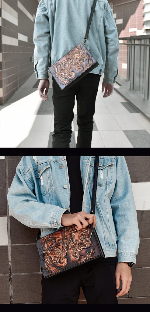 Style: Handmade Black Tooled Lion Dragon Leather Messenger Bags Side Bag Clutch Wristlet Bag For Men