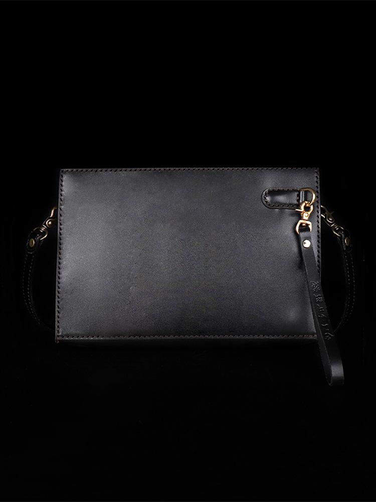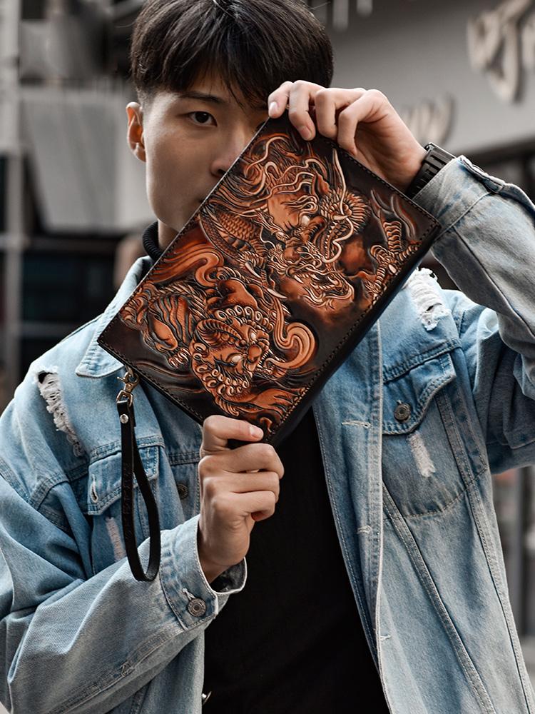 Design: Handmade Black Tooled Lion Dragon Leather Messenger Bags Side Bag Clutch Wristlet Bag For Men