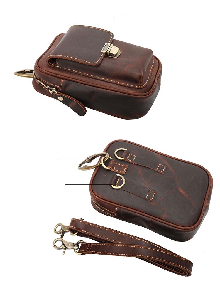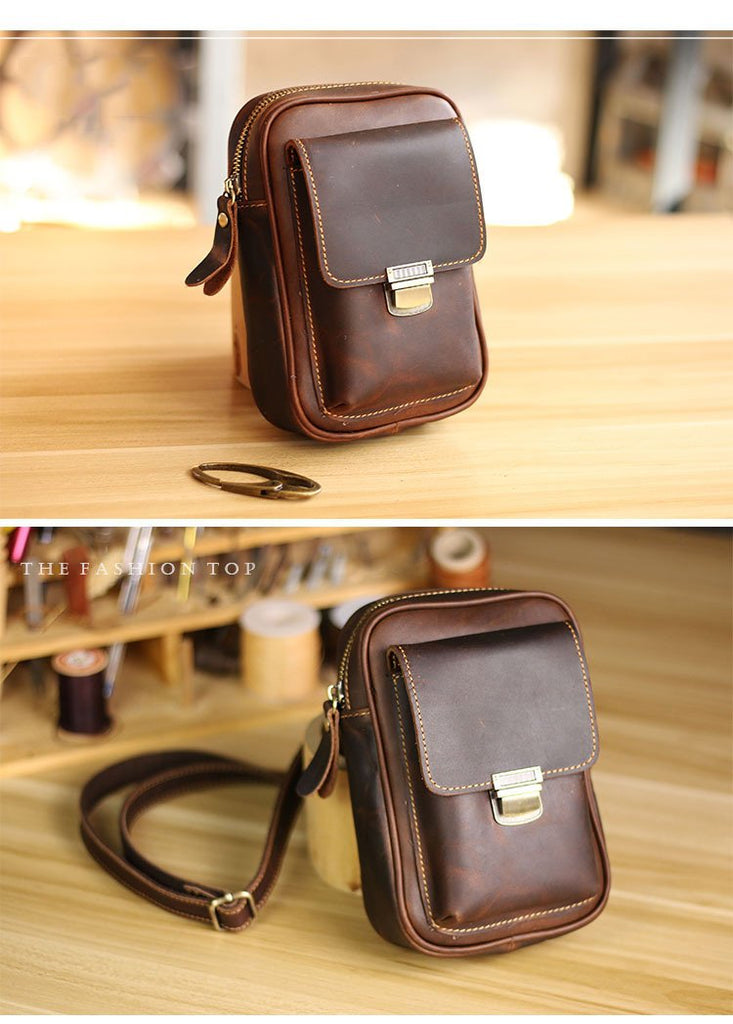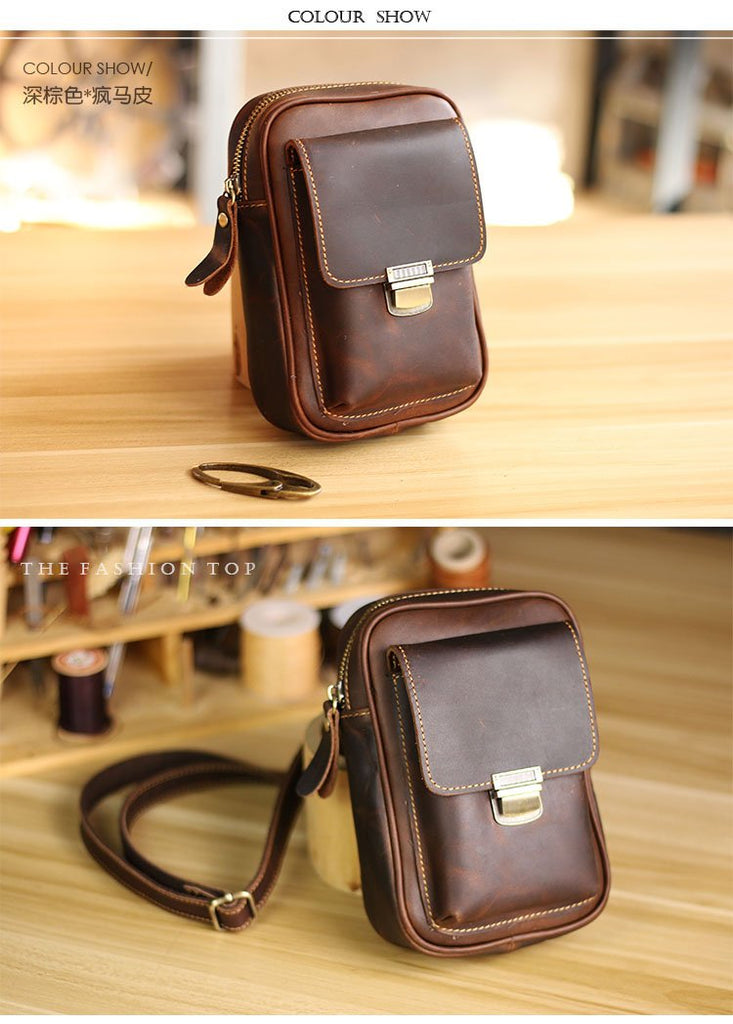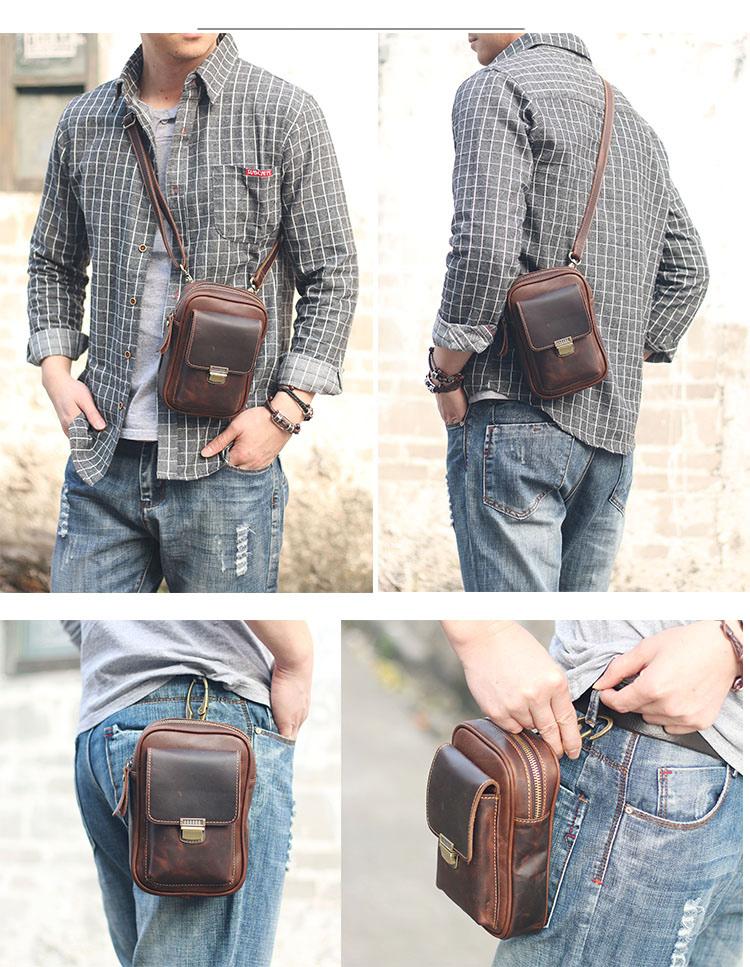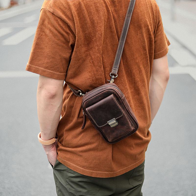 Design: Black Vintage Leather Mens Small Messenger Bag Waist Bag Dark Brown Belt Pouch Bag For Men