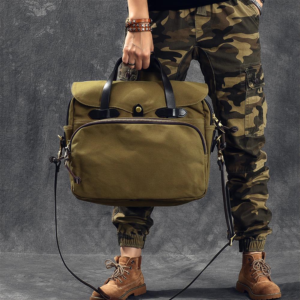 Canvas Leather Mens Khaki Briefcase 15'' Side Bag Messenger Bag Shoulder Bag For Men