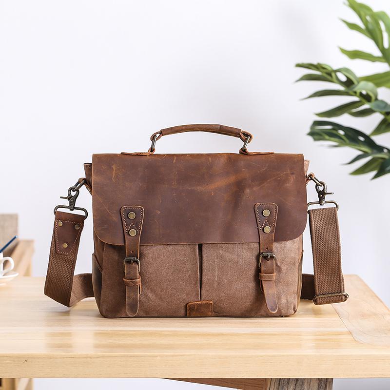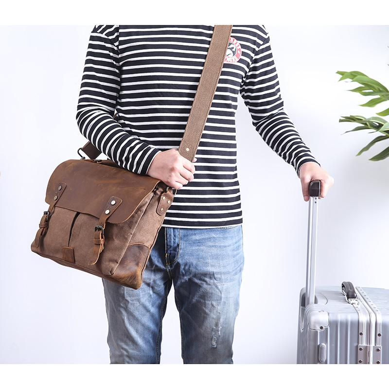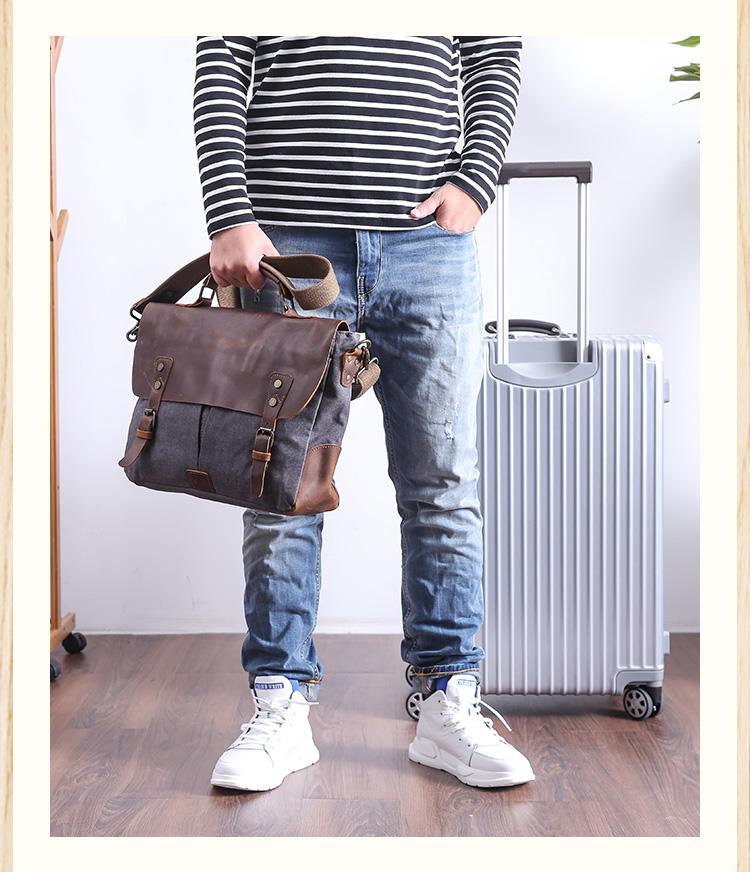 Design: Casual Canvas Leather Mens Khaki Handbag 14'' Side Bag Gray Messenger Bag For Men