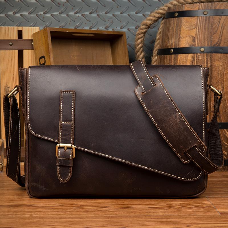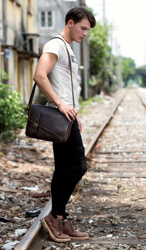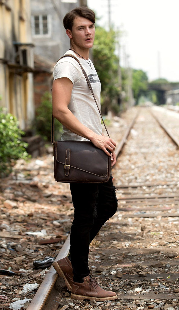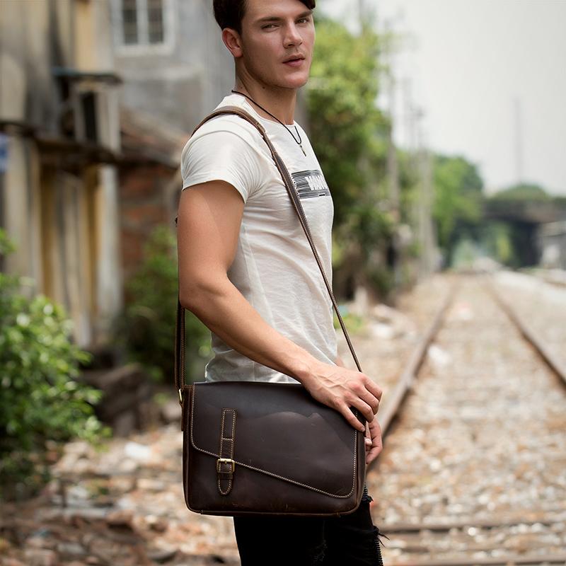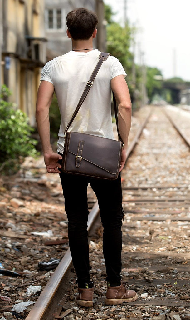 Style: Dark Brown Leather 13 inches Mens Small Messenger Bags Shoulder Bags for Men
