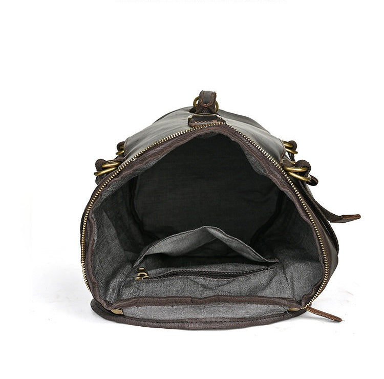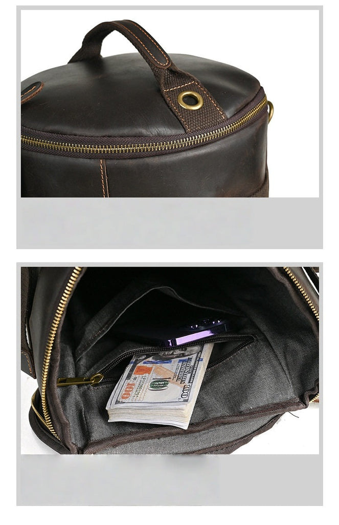 Inside, the bag is thoughtfully lined with tough canvas and includes a main zippered pocket, a handy side slot, an additional zippered compartment, and a dedicated wallet slot—keeping your essentials safe, organized, and within easy reach. Whether you’re heading to the gym, traveling light, or just moving through your daily routine, this Leather Bucket Backpack brings together rugged good looks, smart functionality, and flexible carrying options in one timeless package.