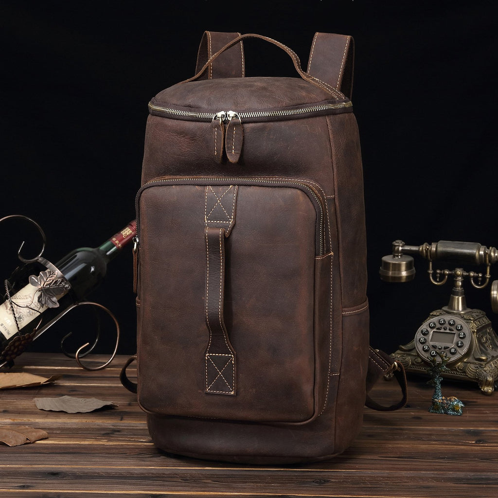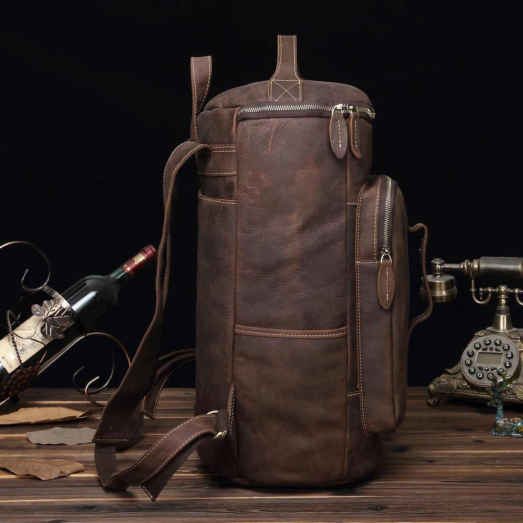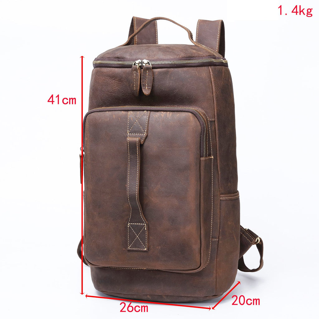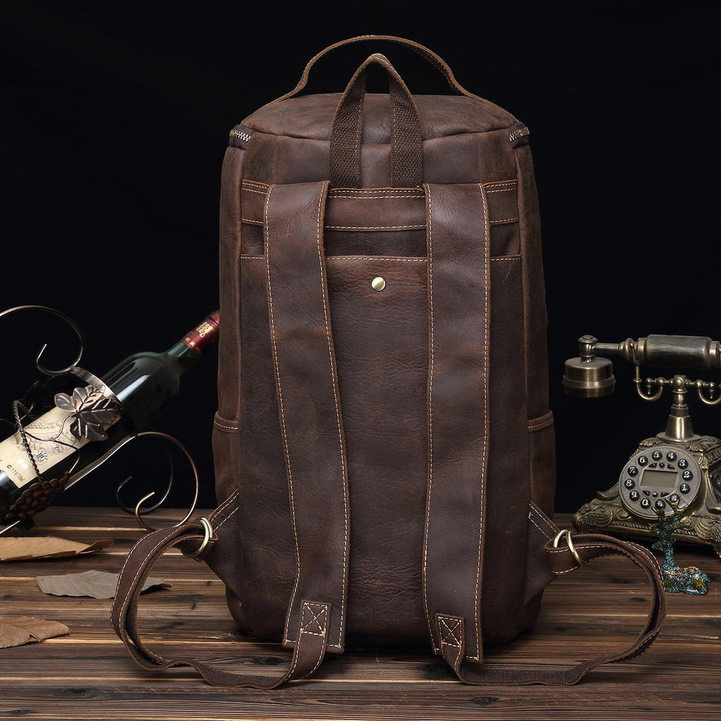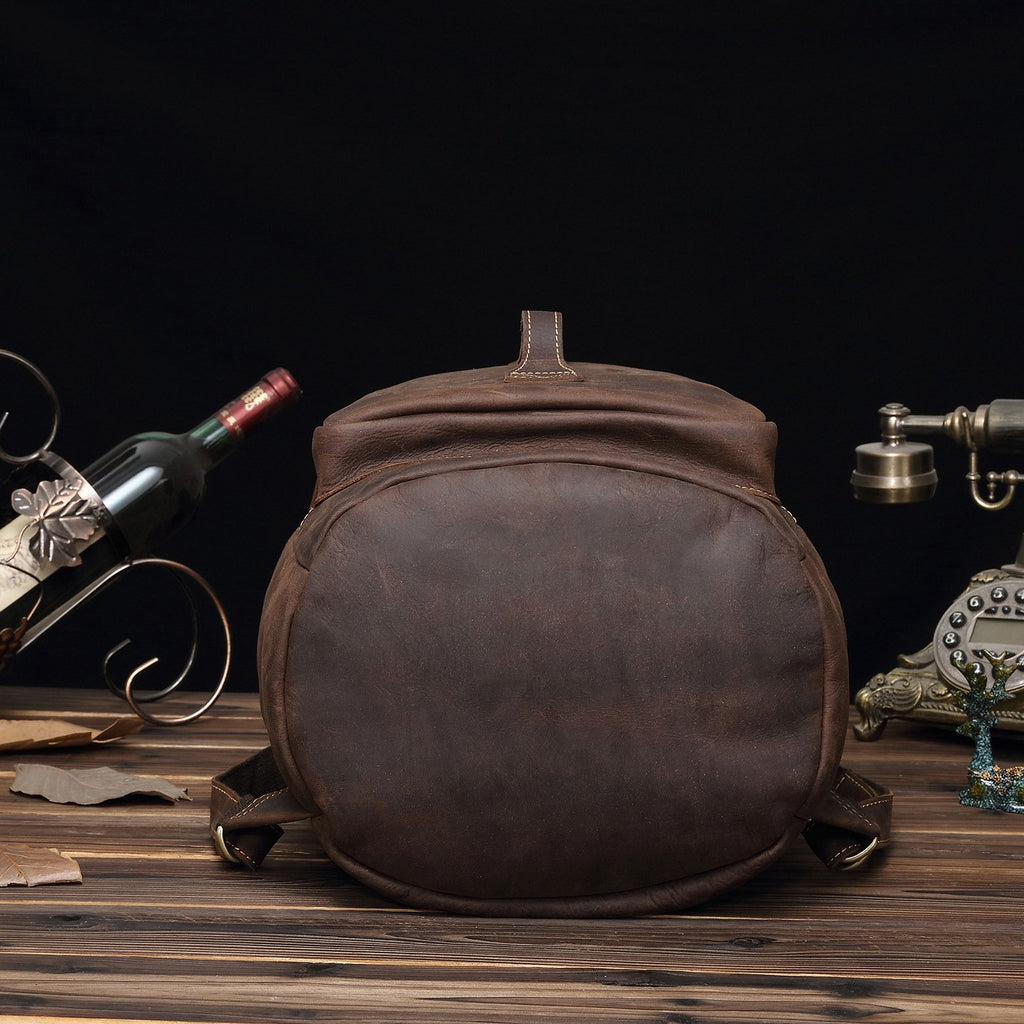 Dark Coffee Bucket Leather Men's 14 inches Large College Backpack Barrel Travel Backpack For Men