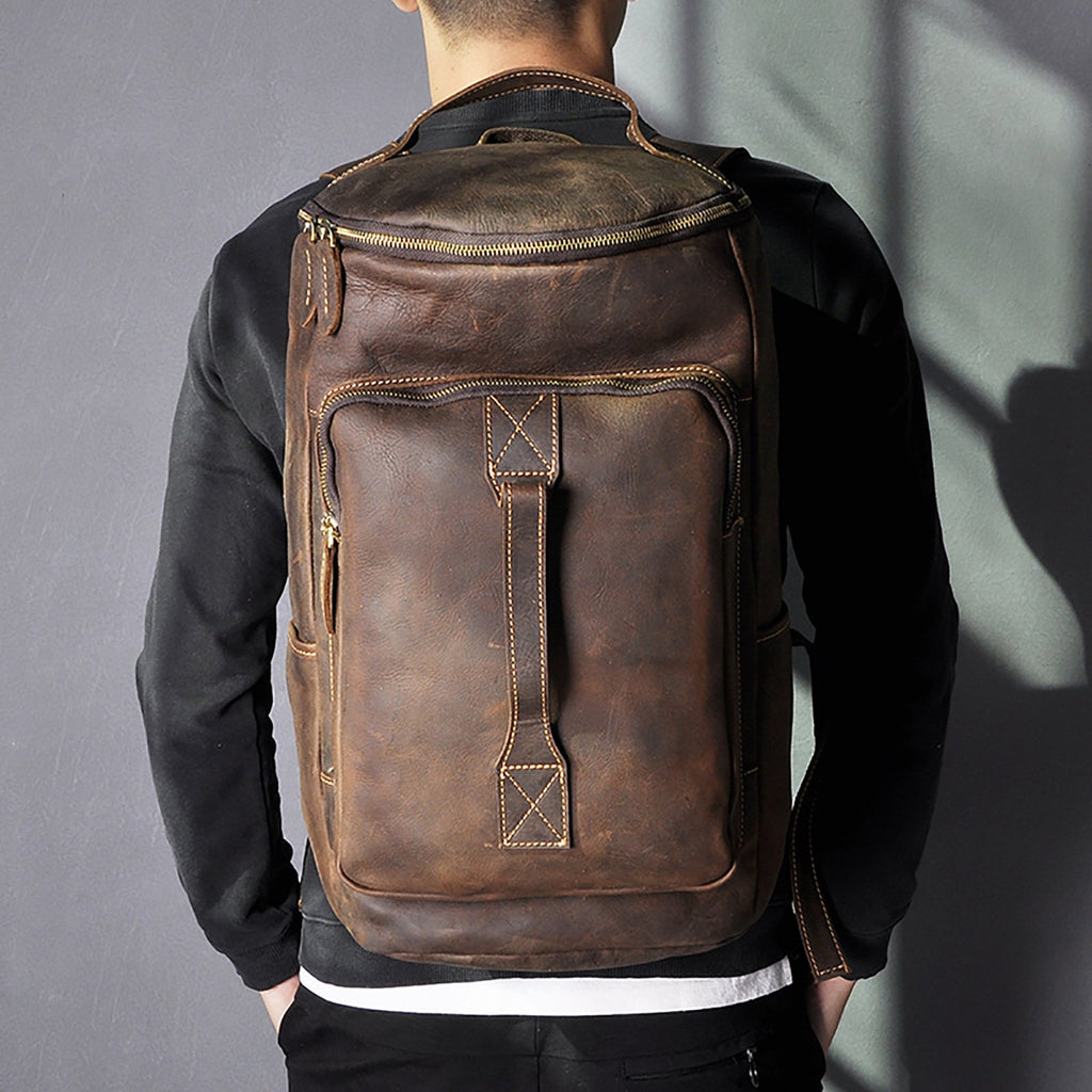 Style: Dark Brown Leather Men's 14 inches Large College Backpack Dark Brown Large Travel Backpack  For Men