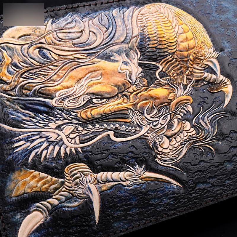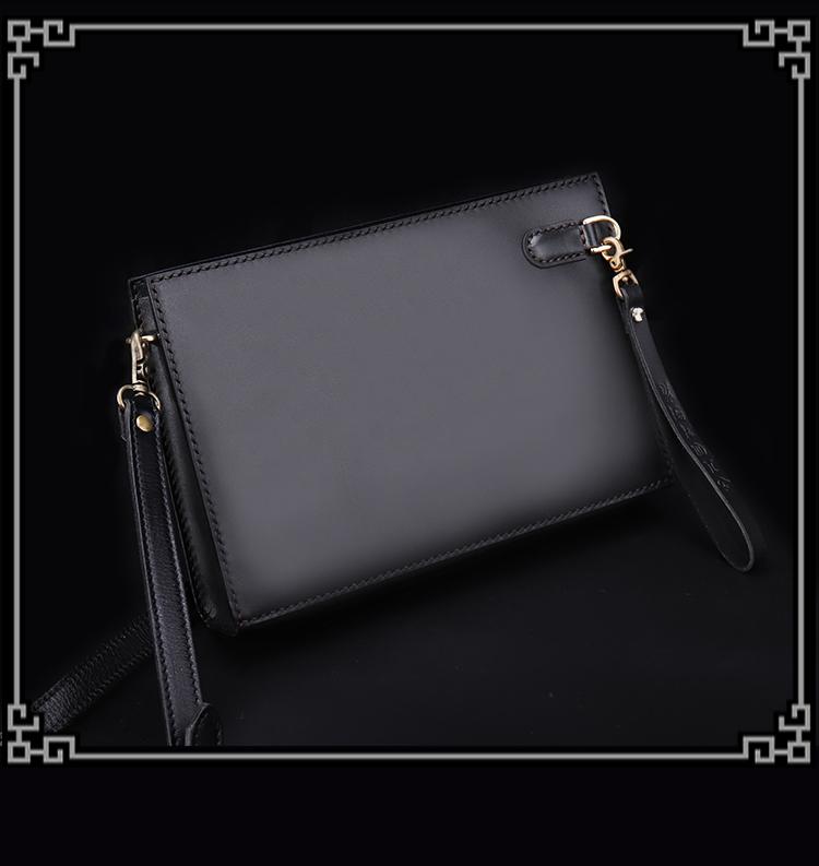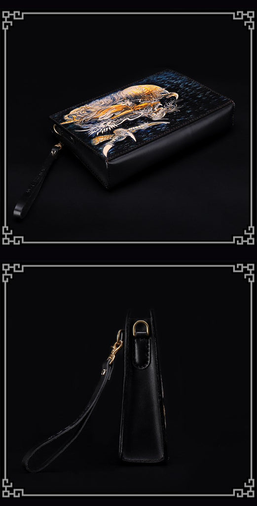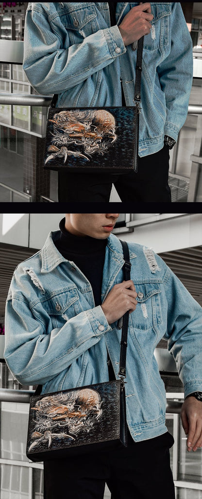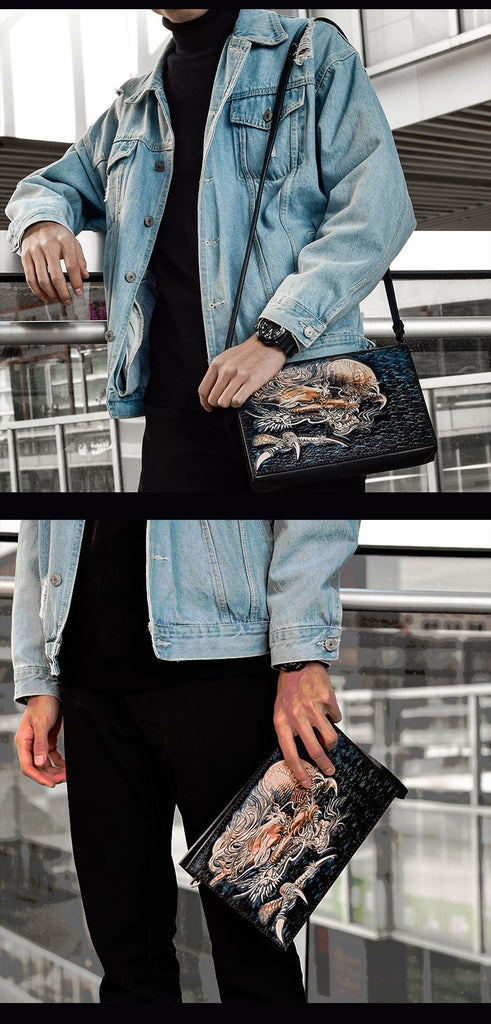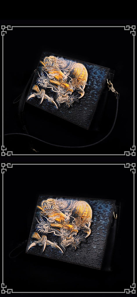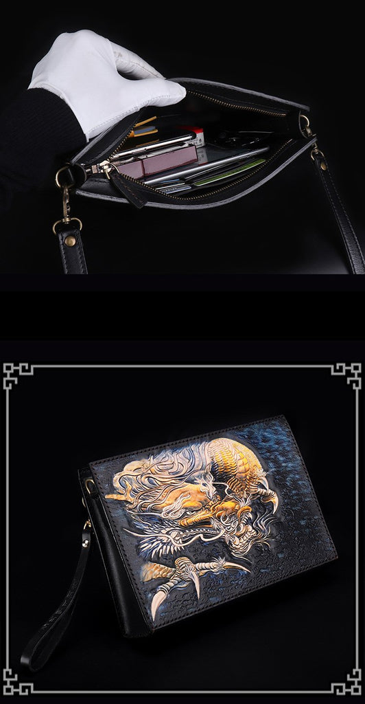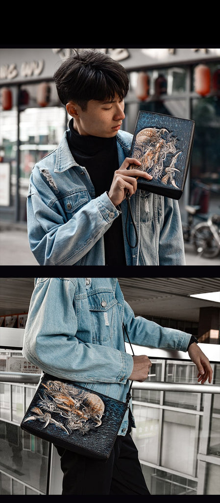 Design: Handmade Black Tooled Chinese Dragon Leather Messenger Bags Side Bag Clutch Wristlet Bag For Men