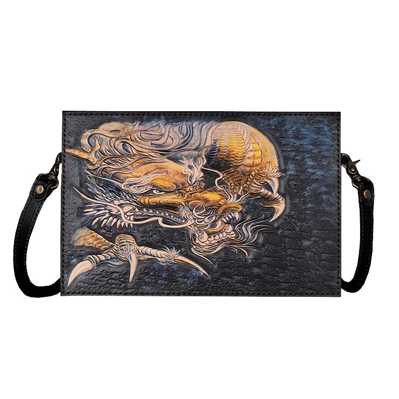 Style: Handmade Black Tooled Chinese Dragon Leather Messenger Bags Side Bag Clutch Wristlet Bag For Men