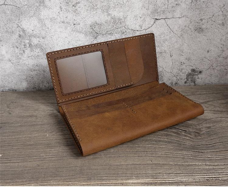 Design: Handmade Brown Leather Mens Bifold Long Wallet Lots Cards Travel Long Wallet for Men