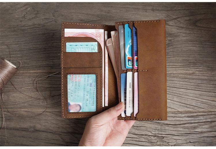 Style: Handmade Brown Leather Mens Bifold Long Wallet Lots Cards Travel Long Wallet for Men