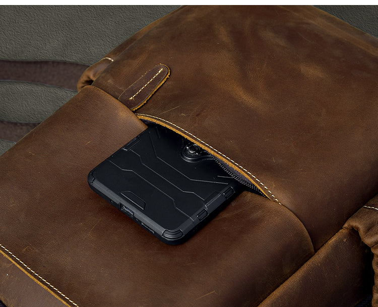 The large leather men's sling bag features a thoughtfully organized layout to keep your belongings secure and easily accessible. The main compartment, secured with a zipper, is spacious enough to hold all your essentials, whether you're heading to work, school, or a weekend getaway. Within this main slot, there's a dedicated laptop slot that ensures your device stays protected and in place, making it an ideal choice for professionals and students alike.