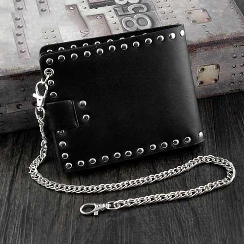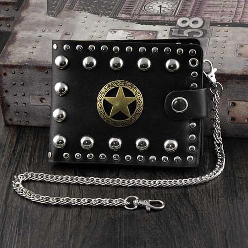 Design: Punk Black Leather Men's Small Biker Wallet Chain Wallet Golden Star billfold Wallet with Chain For Men